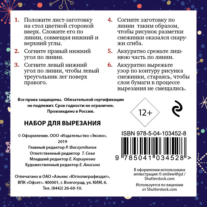 Пусть этот маленький набор бумажных снежинок станет первым шагом в подготовке к Новому Году! Украсьте ими окно, зеркало, елку, открытку, используйте для сервировки праздничного стола или в качестве дополнения к упаковке новогоднего подарка. В комплекте вы найдете восемь цветных листов-заготовок с уже нанесенной разметкой контура для вырезания ажурных снежинок. Вам нужно всего лишь сложить лист-заготовку по приведенной на упаковке схеме и затем вырезать ножницами снежинку по линиям.| Издательство | ООО "Издательство "Эксмо" |