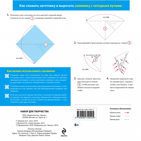 Все, что от вас потребуется, - это сложить лист-заготовку по приведенной на упаковке схеме и затем вырезать ножницами снежинку по линиям.