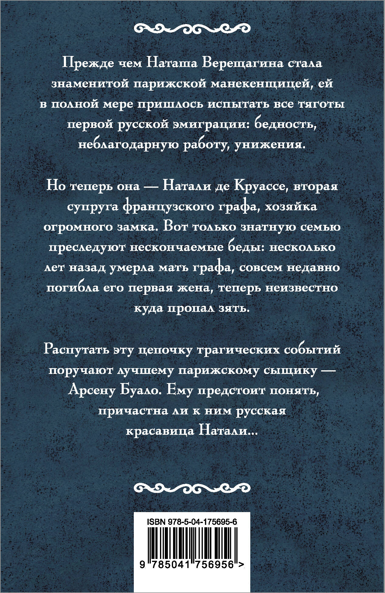 Прежде чем Наташа Верещагина стала знаменитой парижской манекенщицей, ей в полной мере пришлось испытать все тяготы первой русской эмиграции: бедность, неблагодарная работа, унижения. Но теперь она - Натали де Круассе, вторая супруга французского графа, хозяйка огромного замка. Вот только знатную семью преследуют нескончаемые беды: несколько лет назад умерла мать графа, совсем недавно погибла его первая жена, теперь неизвестно куда пропал зять. Распутывать эту цепочку трагических событий поручают лучшему парижскому сыщику - Арсену Буало. Ему предстоит понять, причастна ли к ним русская красавица Натали… Валерия Вербинина - мастер исторического детектива, автор более 50 романов в этом жанре. В своих книгах она блестяще передает реалии жизни Советской России 20-х-30-х годов прошлого века, на фоне которых развивается виртуозно закрученная интрига.| Издательство | ООО "Издательство "Эксмо" |