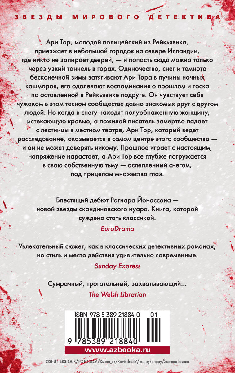 Ари Тор, молодой полицейский из Рейкьявика, приезжает в небольшой городок на севере Исландии, где никто не запирает дверей, - и попасть сюда можно только через узкий тоннель в горах. Одиночество, снег и темнота бесконечной зимы затягивают Ари Тора в пучины ночных кошмаров, его одолевают воспоминания о прошлом и тоска по оставленной в Рейкьявике подруге. Он чувствует себя чужаком в этом тесном сообществе давно знакомых друг с другом людей. Но когда в снегу находят полуобнаженную женщину, истекающую кровью, а пожилой писатель замертво падает с лестницы в местном театре, Ари Тор, который ведет расследование, оказывается в самом центре этого сообщества - и он не может доверять никому. Прошлое играет с настоящим, напряжение нарастает, а Ари Тор все глубже погружается в свою собственную тьму - ослепленный снегом, под прицелом множества глаз.