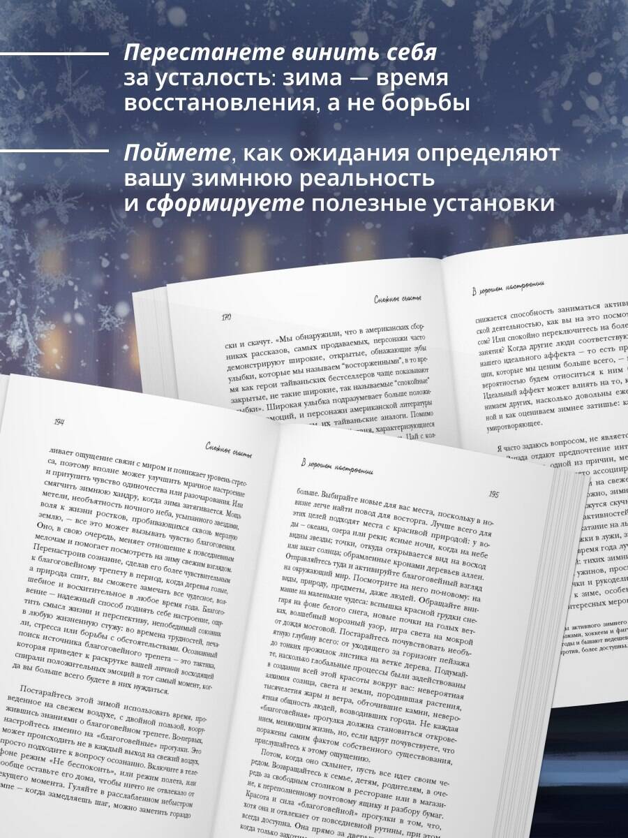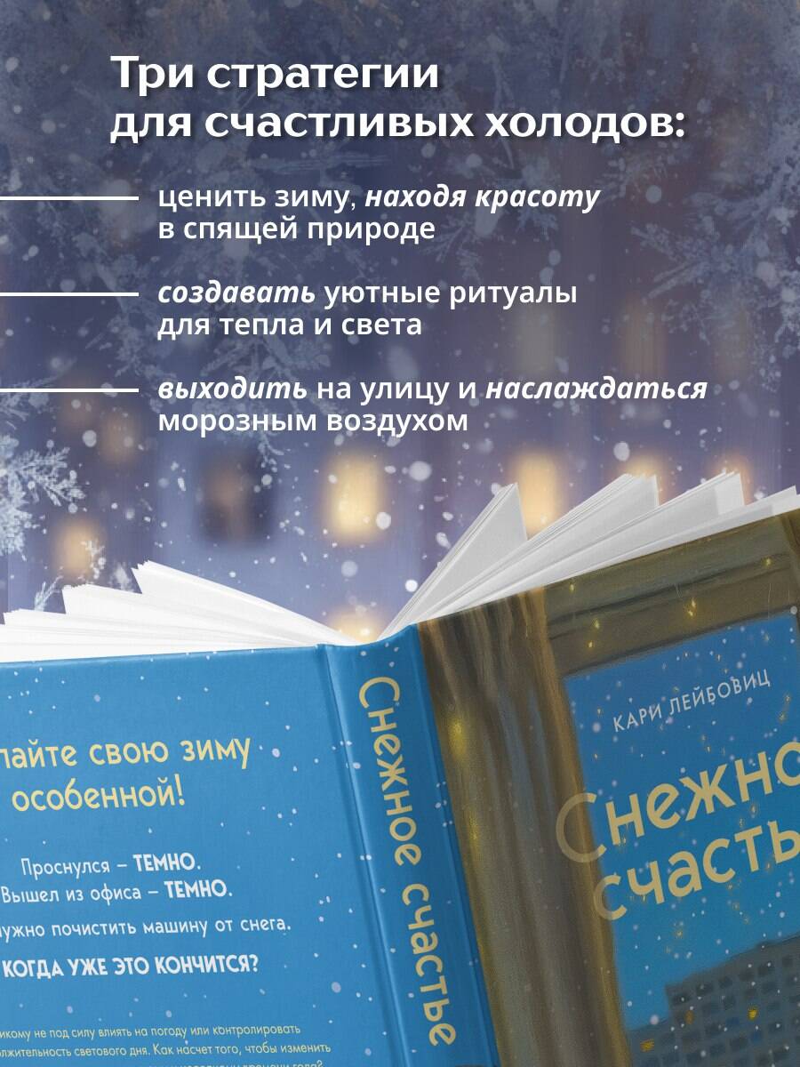 СДЕЛАЙТЕ СВОЮ ЗИМУ ОСОБЕННОЙ! Проснулся - темно. Вышел из офиса - темно. Еще нужно почистить машину от снега. Когда уже это кончится?! Никому не под силу влиять на погоду или контролировать продолжительность светового дня. Как насчет того, чтобы изменить свое отношение к самому темному и холодному времени года? «Снежное счастье» - не просто книга о том, как полюбить зиму. Это обширное исследование психологии мышления и менталитета. Внутри вы найдете стратегии и практические рекомендации, которые помогут сменить внутреннюю оптику, чтобы научиться находить смысл, радость и устойчивость даже в периоды холода и тьмы - как во внешнем мире, так и внутри себя. «Это не просто руководство по поиску радости зимой, это действительно меняющее жизнь исследование человеческой природы и психологии». - Хелен Расселл, автор книги «Хюгге, или уютное счастье по-датски» «Основные стратегии для превращения жизненных вызовов в возможности для роста». - Кэрол Дуэк, автор книги «Гибкое сознание» «Идеальное сочетание науки, увлекательной истории и практических рекомендаций. Научившись любить зиму, мы можем глубже понять способность нашего мышления контролировать нашу реальность». - Келли Макгонигал, автор книги «Сила воли» ОБ АВТОРЕ Кари Лейбовиц - доктор философии, выпускница Стэнфордского университета, ведущий мировой эксперт по использованию психологии мышления для улучшения здоровья и благополучия.| Издательство | ООО "Издательство "Эксмо" |