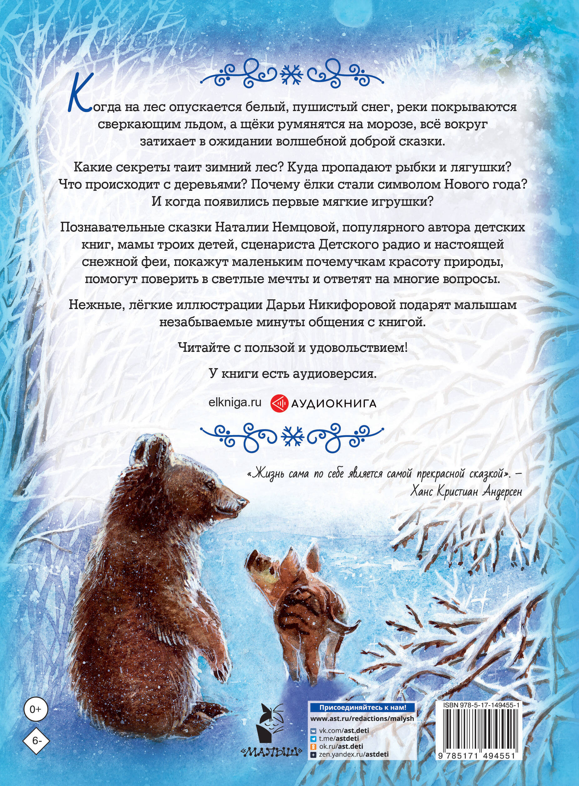 Зима на носу, а значит - самое время погрузиться в сказочную атмосферу заснеженного леса с переливающимися елями, пушистыми сугробами и стайками красногрудых снегирей. Познавательные сказки популярного детского автора Наталии Немцовой раскроют для вашего малыша тайны зимнего леса, познакомят с повадками его обитателей, помогут стать добрее и мудрее. Воздушные иллюстрации Дарьи Никифоровой очаруют красотой и подарят праздничное настроение.| Издательство | ИЗДАТЕЛЬСТВО "АСТ" |