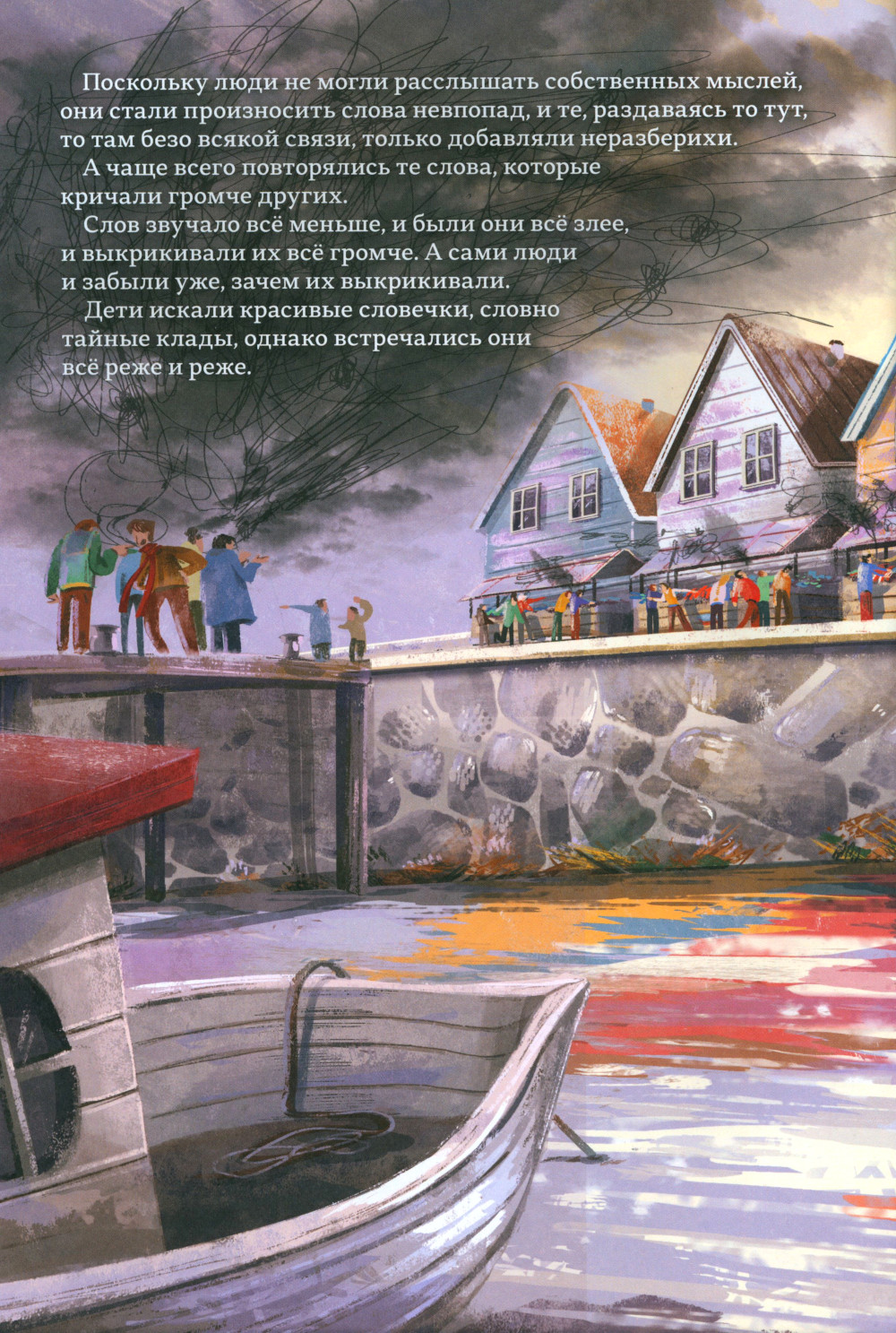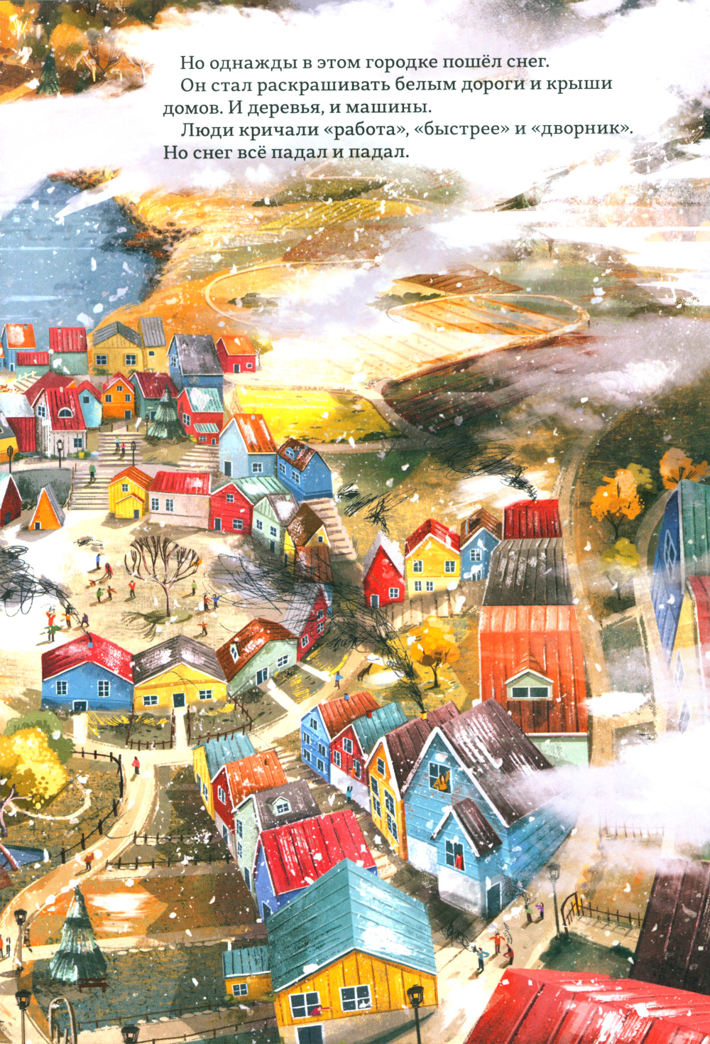Жители маленького городка болтают и болтают без остановки. Поскольку каждый хочет, чтобы услышали именно его голос, все наперебой кричат, заглушая друг друга. Постепенно добрые и нежные слова полностью исчезают из их жизни. Сильнее всего от этого страдают дети: они всё ищут и ищут слова, которых больше не существует. Но начинается потрясающий снегопад, который преображает всё вокруг. Городок словно вымерзает, а слова пропадают. На следующее утро ни у кого не хватает смелости нарушить идеальное безмолвие, пока те слова, которые казались забытыми, не являются снова во всём своём блеске.| Издательство | Городец |