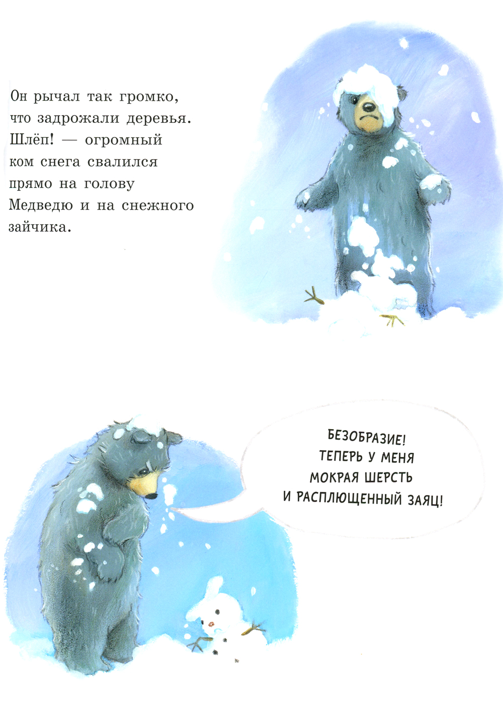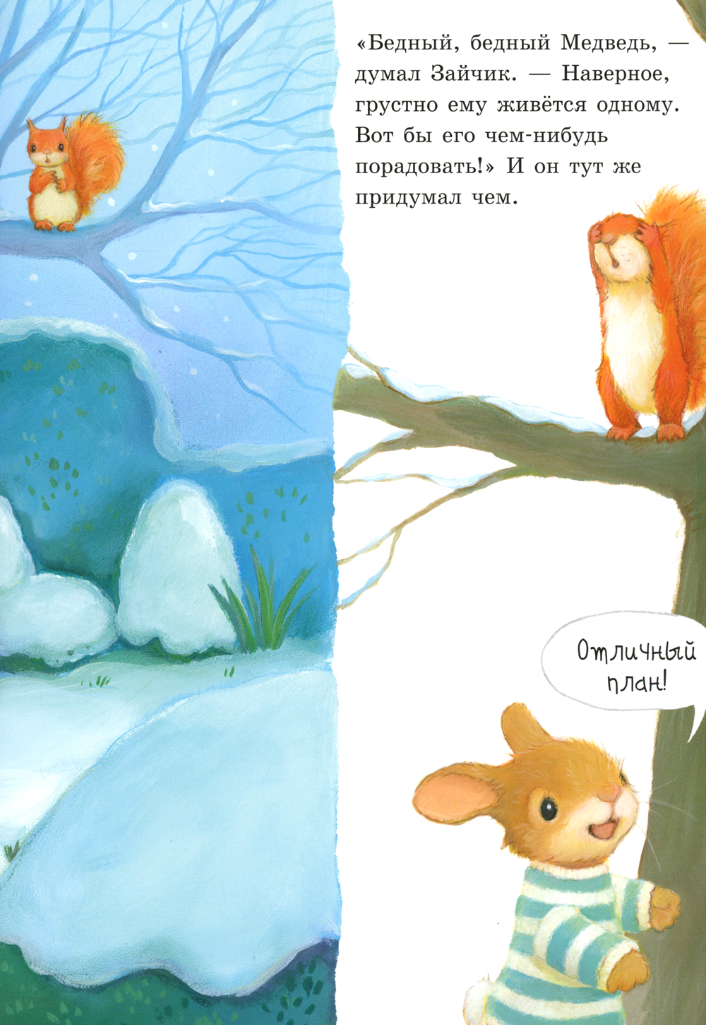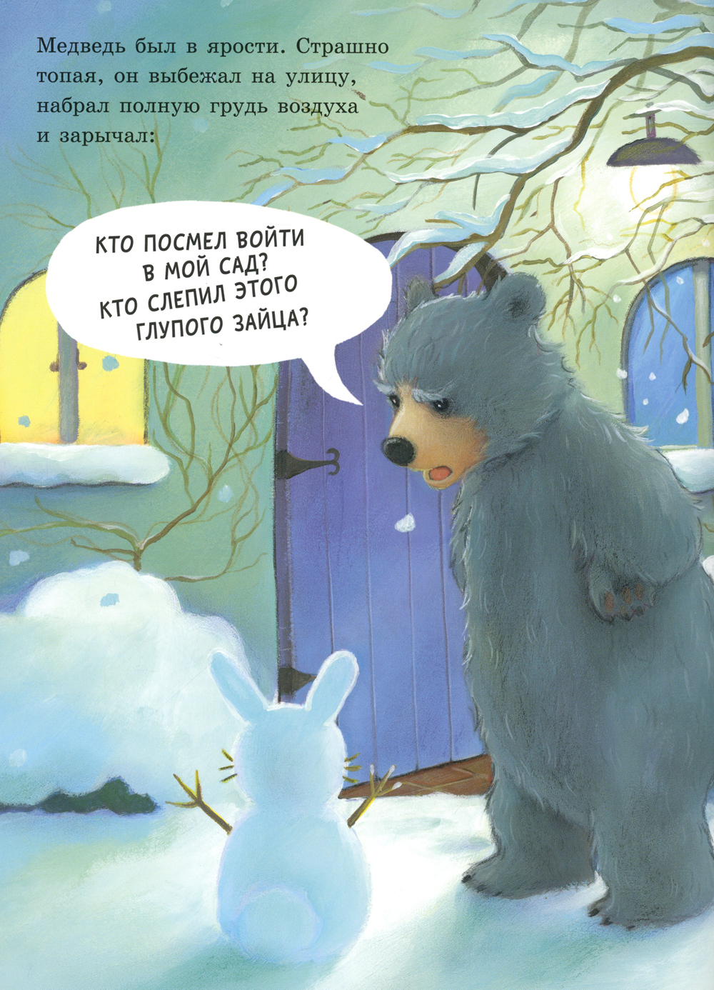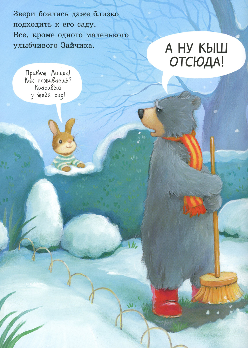 Жил-был в лесу очень сердитый Медведь. Целыми днями он только и знал, что рычать и ворчать на всех, кто осмеливался близко подойти к его красивому, ухоженному саду, посреди которого торчала огромная табличка «Посторонним вход воспрещен!» Все звери боялись Медведя - все, кроме одного маленького улыбчивого зайчика. «Бедный, бедный Медведь, - думал Зайчик. -Грустно ему, наверное, живется одному. Вот бы его чем-нибудь порадовать!» И он решил слепить в медвежьем саду снеговика, надеясь, что Медведю понравится сюрприз. Но не тут-то было! Вместо того, чтобы обрадоваться такому подарку, Медведь пришел в ярость оттого, что кто-то без спроса пробрался в его любимый сад. Но все же благодаря своему кроткому нраву Зайчик сумел найти путь к сердцу Медведя и растопить его.| Издательство | Мелик-Пашаев |