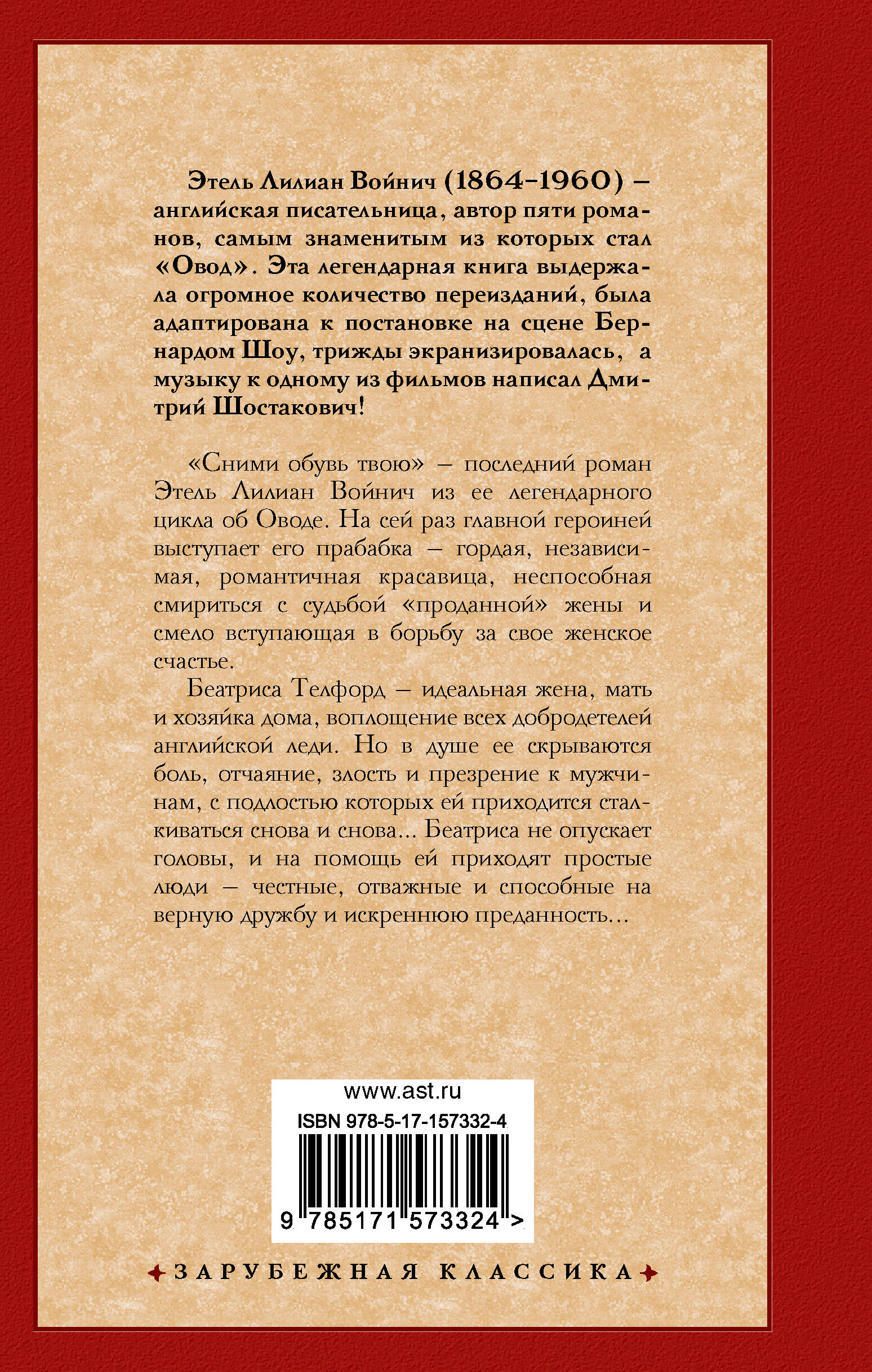 "Сними обувь твою" - последний роман Этель Лилиан Войнич из ее легендарного цикла об Оводе. На сей раз главной героиней выступает его прабабка - гордая, независимая, романтичная красавица, неспособная смириться с судьбой "проданной" жены и смело вступающая в борьбу за свое женское счастье. Беатриса Телфорд - идеальная жена, мать и хозяйка дома, воплощение всех добродетелей английской леди. Но в душе ее скрываются боль, отчаяние, злость и презрение к мужчинам, с подлостью которых ей приходится сталкиваться снова и снова… Беатриса не опускает головы, и на помощь ей приходят простые люди - честные, отважные и способные на верную дружбу и искреннюю преданность...| Издательство | ИЗДАТЕЛЬСТВО "АСТ" |