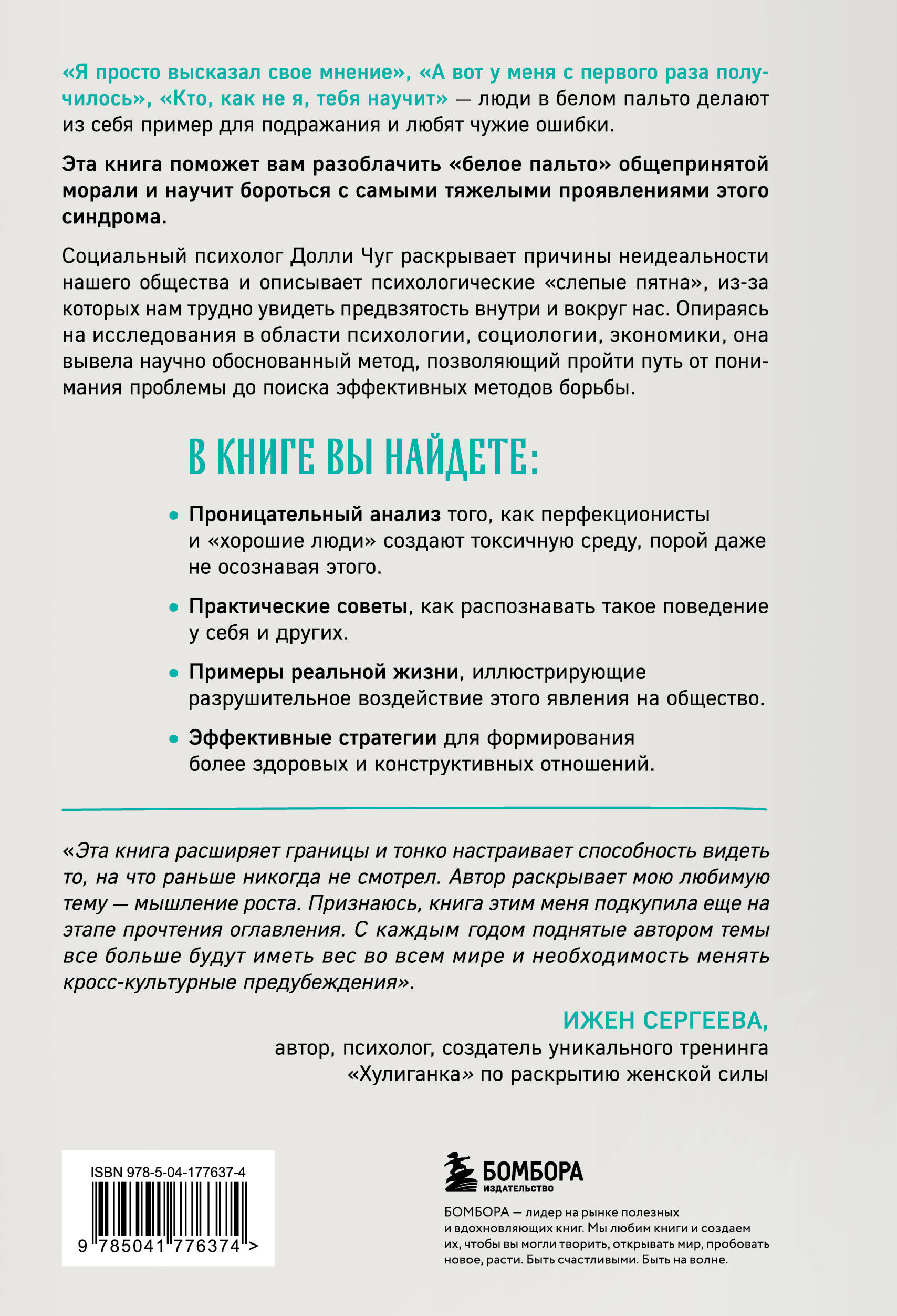 «Я просто высказал свое мнение», «А вот у меня с первого раза получилось», «Кто, как не я, тебя научит» - люди в белом пальто делают из себя пример для подражания и любят чужие ошибки. Эта книга поможет вам разоблачить «белое пальто» общепринятой морали и научит бороться с самыми тяжелыми проявлениями этого синдрома. Социальный психолог Долли Чуг раскрывает причины неидеальности нашего общества и описывает психологические «слепые пятна», из-за которых нам трудно увидеть предвзятость внутри и вокруг нас. Опираясь на исследования в области психологии, социологии, экономики, она вывела научно-обоснованный метод, позволяющий пройти путь от понимания проблемы до поиска эффективных методов борьбы. В книге вы найдете: - Проницательный анализ того, как перфекционисты и «хорошие люди» создают токсичную среду, порой даже не осознавая этого. - Практические советы, как распознавать такое поведение у себя и других. - Примеры из реальной жизни, иллюстрирующие разрушительное воздействие этого явления на общество. - Эффективные стратегии для формирования более здоровых и конструктивных отношений.| Издательство | ООО "Издательство "Эксмо" |