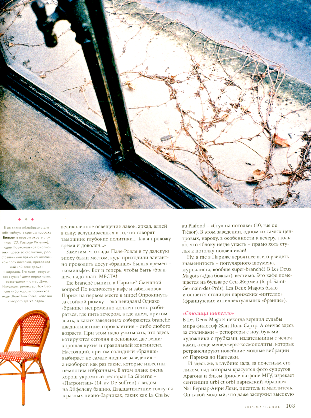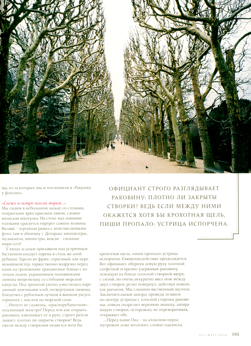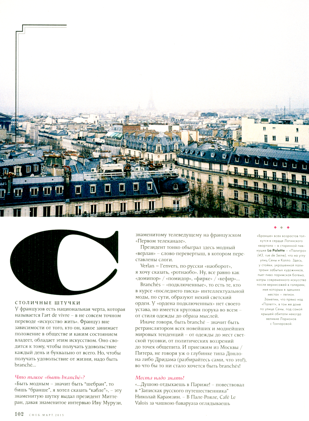 ...А еще в этом номере много Парижа, его воздуха, запахов, ароматов и света. Все проходит, а он остается. Все меняется, а он все так же прекрасен. И мысль о нем, как и надежда на новую встречу, заставляет совсем по-другому относиться к собственным горестям и потерям. Поэтому скажем ему, как говорят парижане друг другу: A demain! И пусть это завтра уже скорее наступит.| Издательство | ООО Сноб Медиа |