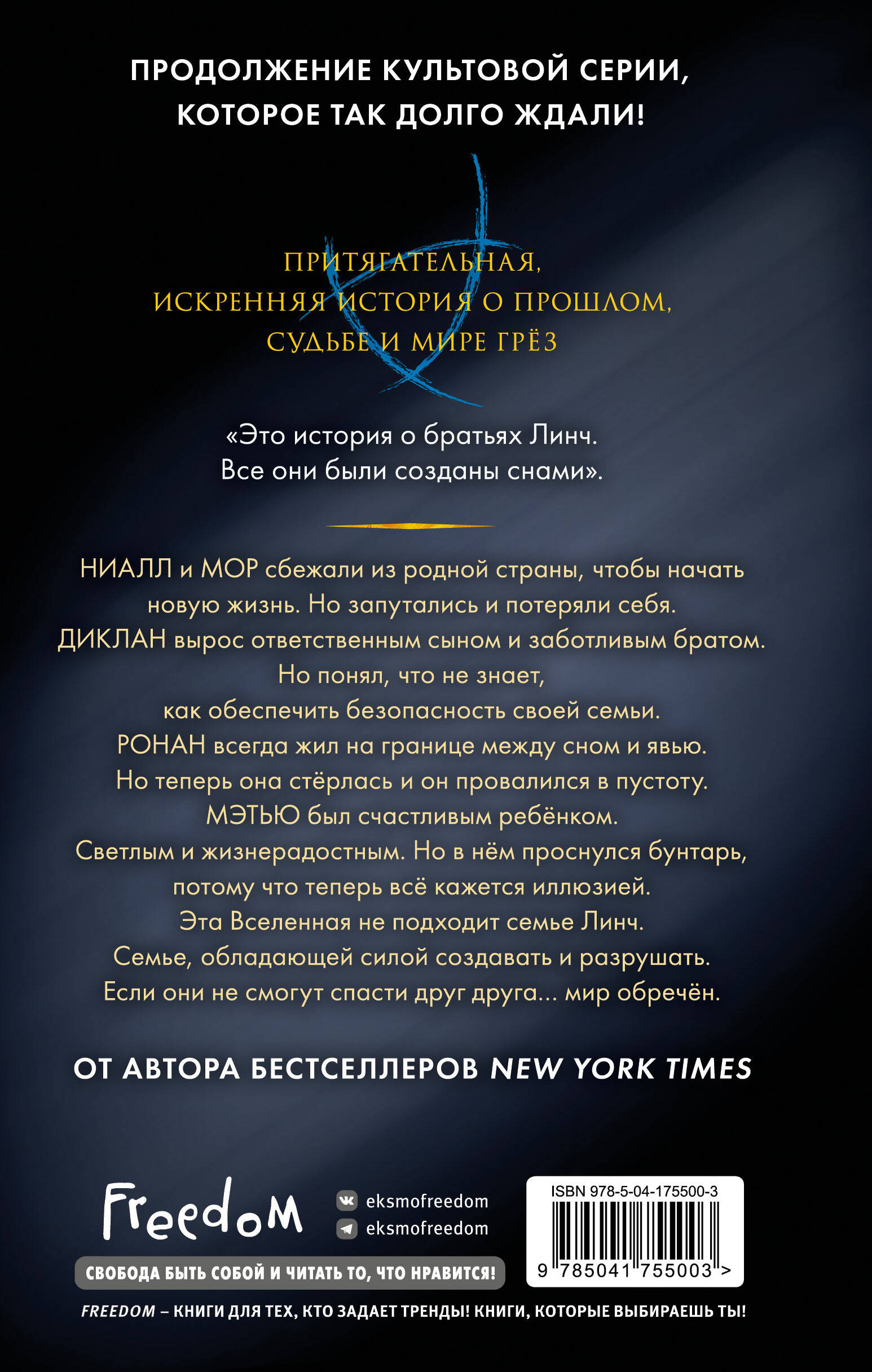 Величественное завершение трилогии Мэгги Стивотер «Сновидец»! Продолжение культового цикла «Воронята» ждали очень долго! Книги расскажут о братьях Линч, одних из самых популярных, загадочных и любимых героев цикла «Воронята». Книги «Воронят» стали самыми обсуждаемыми в Сети! Несколько тысяч постов! И количество растет! Легендарный, неповторимый стиль Мэгги Стивотер! Каждую главу можно растаскивать на цитаты. Гипнотизирующая проза, полная магии, тайн, загадок. Это мистика, триллер, детектив - однозначно жанр определить нельзя, но в этом вся Мэгги. Ее книги уникальны! Аналогов нет! «Это история о братьях Линч. Все они были созданы снами». НИАЛЛ и МОР сбежали из родной страны, чтобы начать новую жизнь. Но запутались и потеряли себя. ДИКЛАН вырос ответственным сыном и заботливым братом. Но понял, что не знает, как обеспечить безопасность своей семьи. РОНАН всегда жил на границе между сном и явью. Но теперь она стерлась, и он провалился в пустоту. МЭТЬЮ был счастливым ребенком. Светлым и жизнерадостным. Но в нем проснулся бунтарь, потому что теперь все кажется иллюзией. Эта Вселенная не подходит семье Линч. Семье, обладающей силой создавать и разрушать. Если они не смогут спасти друг друга… мир обречен.| Издательство | ООО "Издательство "Эксмо" |