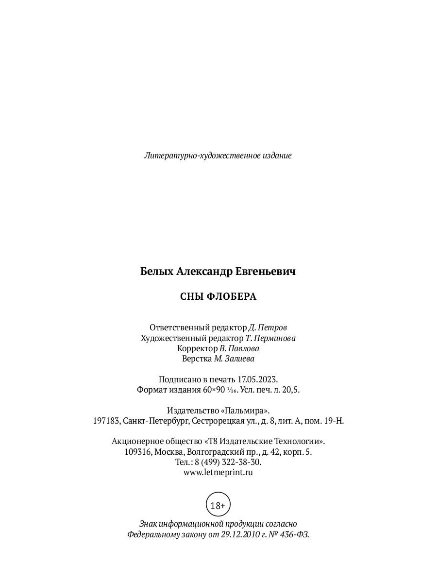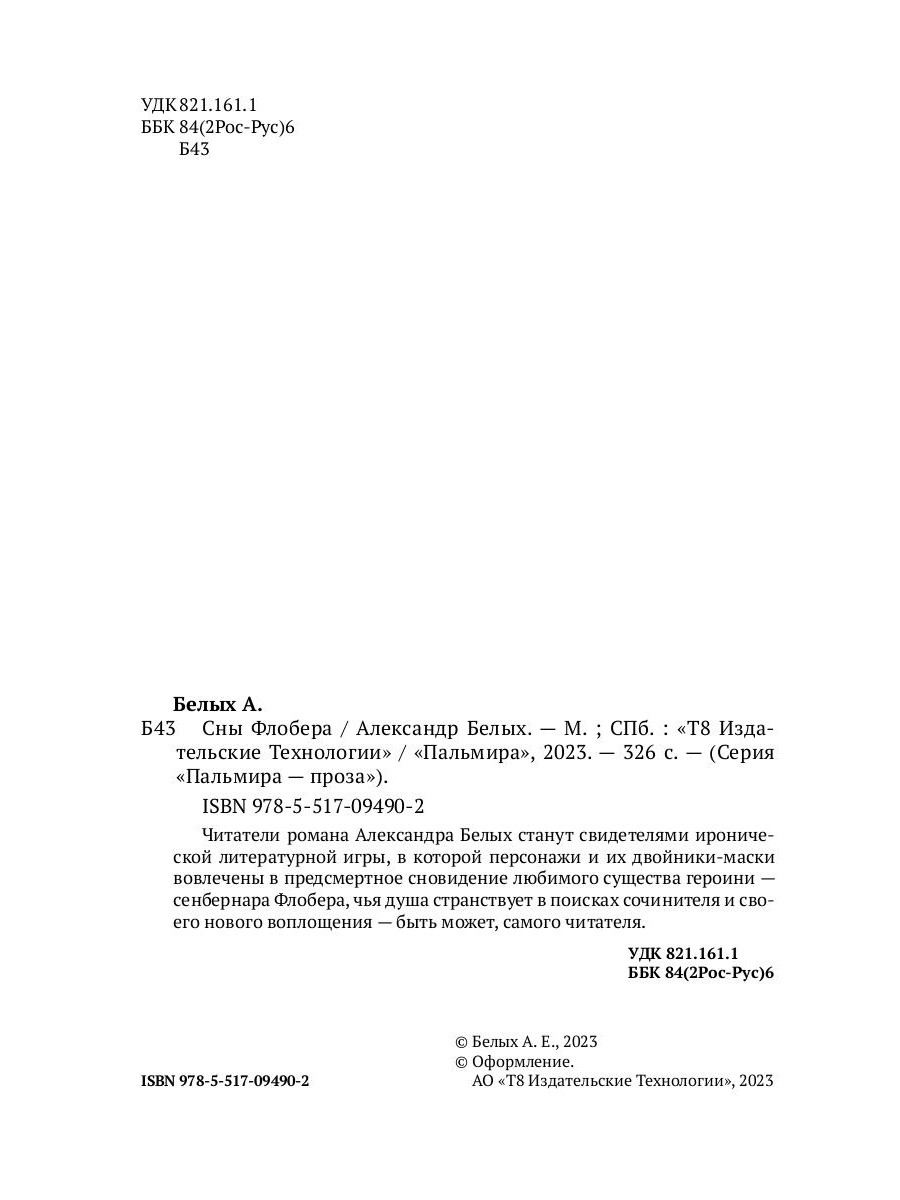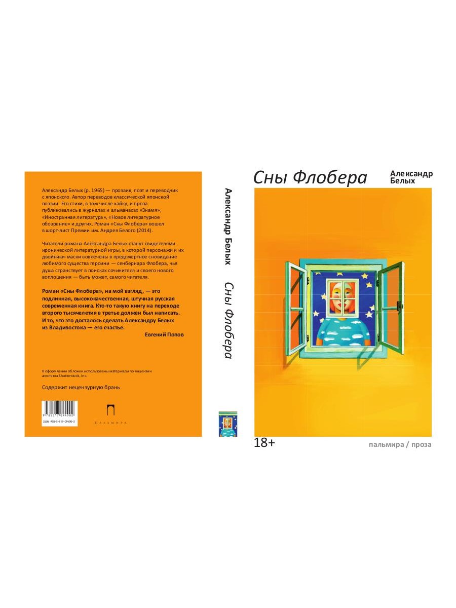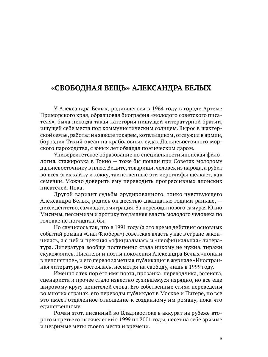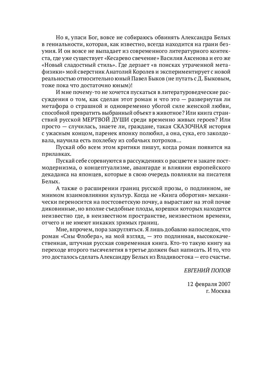 Читатели романа Александра Белых станут свидетелями иронической литературной игры, в которой персонажи и их двойники-маски вовлечены в предсмертное сновидение любимого существа героини - сенбернара Флобера, чья душа странствует в поисках сочинителя и своего нового воплощения - быть может, самого читателя. Роман "Сны Флобера", на мой взгляд, - это подлинная, высококачественная, штучная русская современная книга. Кто-то такую книгу на переходе второго тысячелетия в третье должен был написать. И то, что это досталось сделать Александру Белых из Владивостока - его счастье. Евгений Попов