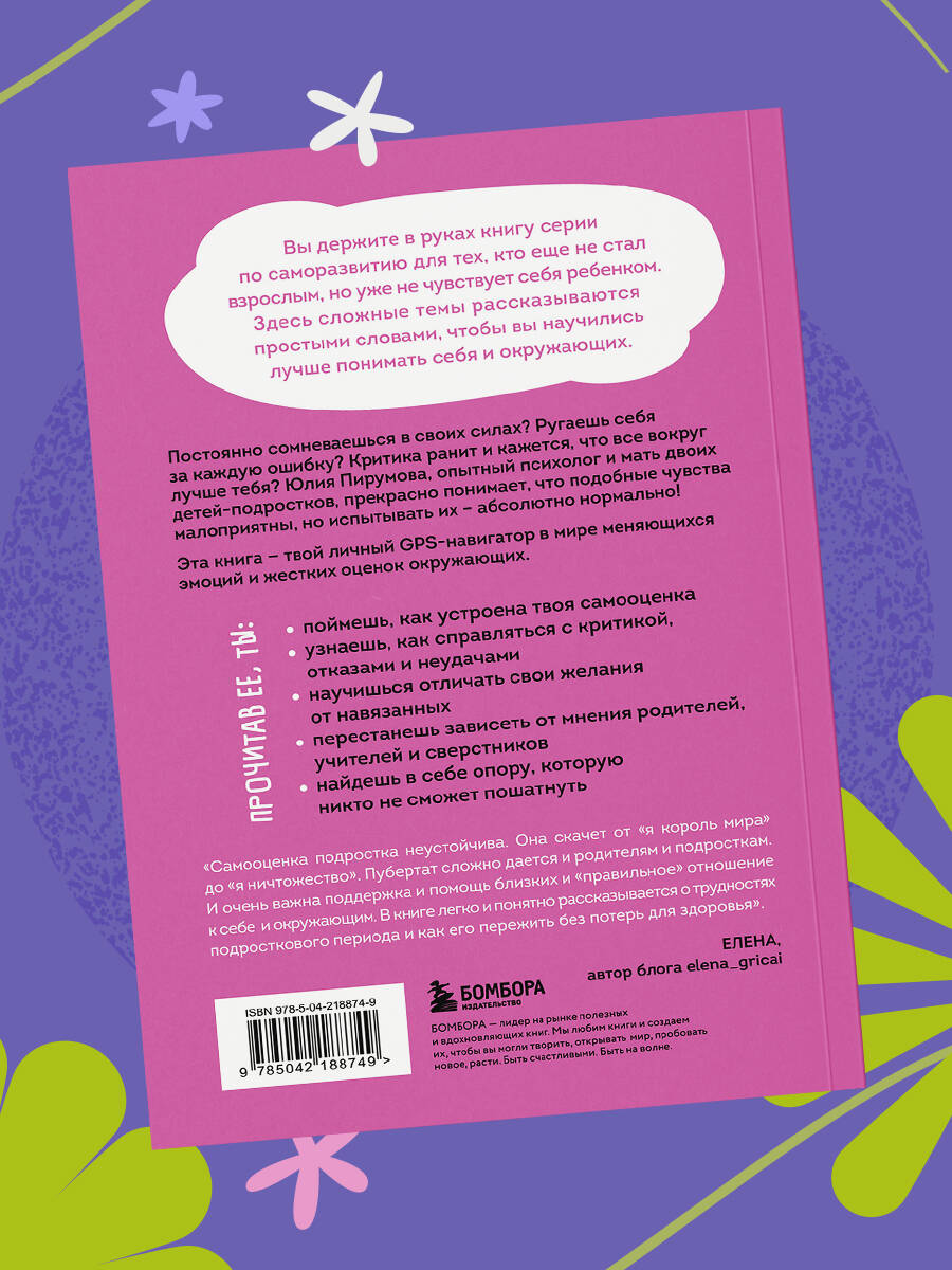 Постоянно сомневаешься в своих силах? Ругаешь себя за каждую ошибку? Критика ранит и кажется, что все вокруг лучше тебя? Юлия Пирумова, опытный психолог и мать двоих детей-подростков, прекрасно понимает, что подобные чувства малоприятны, но испытывать их - абсолютно нормально! Эта книга - твой личный GPS-навигатор в мире меняющихся эмоций и жестких оценок окружающих. Она не будет учить «любить себя всем врагам назло». Вместо этого ты поймешь, как устроена твоя самооценка, откуда берутся эмоциональные качели и как наконец перестать зависеть от чужого мнения. Внутри ты также найдешь чек-листы и упражнения, которые помогут тебе лучше узнать себя и обрести утраченную уверенность. Прочитав эту книгу, ты: • Узнаешь, как справляться с критикой, отказами и неудачами, не разрушая себя. • Научишься отличать свои желания от навязанных ожиданий и говорить «нет» без чувства вины. • Перестанешь зависеть от мнения родителей, учителей и сверстников. • Найдешь в себе опору, которую никто не сможет пошатнуть. ОТЗЫВ: «Самооценка подростка неустойчива. Она скачет от "я король мира" до "я ничтожество". Пубертат сложно дается и родителям и подросткам. И очень важна поддержка и помощь близких и "правильное" отношение к себе и окружающим. В книга легко и понятно рассказывается о трудностях подросткового периода и как его пережить без потерь для здоровья. Эту книгу нужно прочитать и подросткам и их родителям». - Елена, автор блога elena_gricai ЦИТАТЫ: Представь, что твоя личность - это дом, который раньше был детским домиком с простой планировкой. А сейчас в нем идет капитальный ремонт: сносятся старые стены, прокладываются новые коммуникации, достраиваются этажи. Приговоры Доброго Судьи звучат примерно так: «Ты хороший человек, который иногда ошибается», «Ты способный, просто нужно больше практики», «Ты справишься, если не будешь торопиться», «Ты достоин любви, даже когда не идеален». Ты сложный, у тебя разные «участки дороги» в разном состоянии, и это совершенно нормально. Главное - честно видеть всю карту и уметь выбирать подходящие маршруты. Проблемы начинаются, когда ты полностью растворяешься в чужих ожиданиях или, наоборот, везде ведешь себя одинаково, не учитывая контекст. Ты можешь добиться очень многого, но Самозванец каждый раз будет нашептывать: «Это не в счет». И ты так и останешься с ощущением, что ничего особенного не умеешь. А это значит, что внутри тебя всегда будет ощущаться дыра: как будто тебя реального и нет вовсе. Уникальность - это не обязательно то, что видно всем. Твоя уникальность может быть в том, как ты чувствуешь животных и понимаешь людей. Или в том, как видишь связи между вещами, которые другие не замечают. Ты должен научиться настраивать свой GPS не только по сигналам от других людей, но и по собственному внутреннему компасу. Семья - это не просто группа людей, с которыми ты живешь. Это система координат, которая определяет, как ты видишь себя и мир вокруг. Если ты растешь в авторитарной семье, хуже всего приходится эмоциональному отделу. Он учится реагировать не на твои собственные переживания, а на родительские оценки этих переживаний. Конфликт - это не угроза отношениям, а возможность их улучшить. Твоя задача не в том, чтобы избежать шторма или прекратить его. Твоя задача - пережить его, сохранив связь с собой и не разрушив отношения окончат