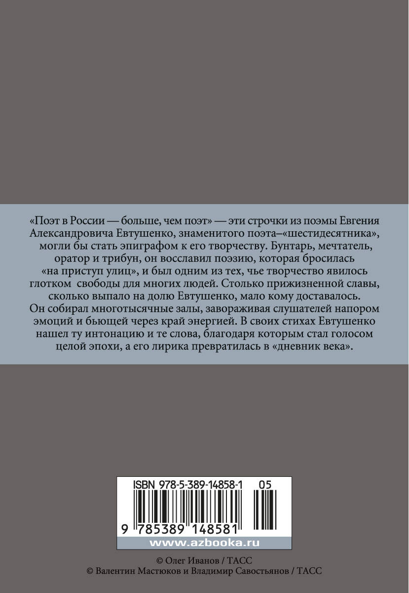 "Поэт в России - больше, чем поэт" - эти строчки из поэмы Евгения Александровича Евтушенко, знаменитого поэта-"шестидесятника", могли бы стать эпиграфом к его творчеству. Бунтарь, мечтатель, оратор и трибун, он восславил поэзию, которая бросилась "на приступ улиц", и был одним из тех, чье творчество явилось глотком свободы для многих людей. Столько прижизненной славы, сколько выпало на долю Евтушенко, мало кому доставалось. Он собирал многотысячные залы, завораживая слушателей напором эмоций и бьющей через край энергией. В своих стихах Евтушенко нашел ту интонацию, и те слова, благодаря которым стал голосом целой эпохи, а его лирика превратилась в "дневник века". Сегодня Евтушенко знают во всем мире, его произведения переведены более чем на семьдесят языков, а на его стихи написаны десятки песен ("Хотят ли русские войны?", "Со мною вот что происходит…", "Ольховая сережка", "А снег повалится, повалится…", "Дай Бог!" и другие). В настоящее издание вошли избранные стихотворения Е. Евтушенко, созданные в разные годы жизни.| Издательство | Азбука-Аттикус Издат.группа ООО |