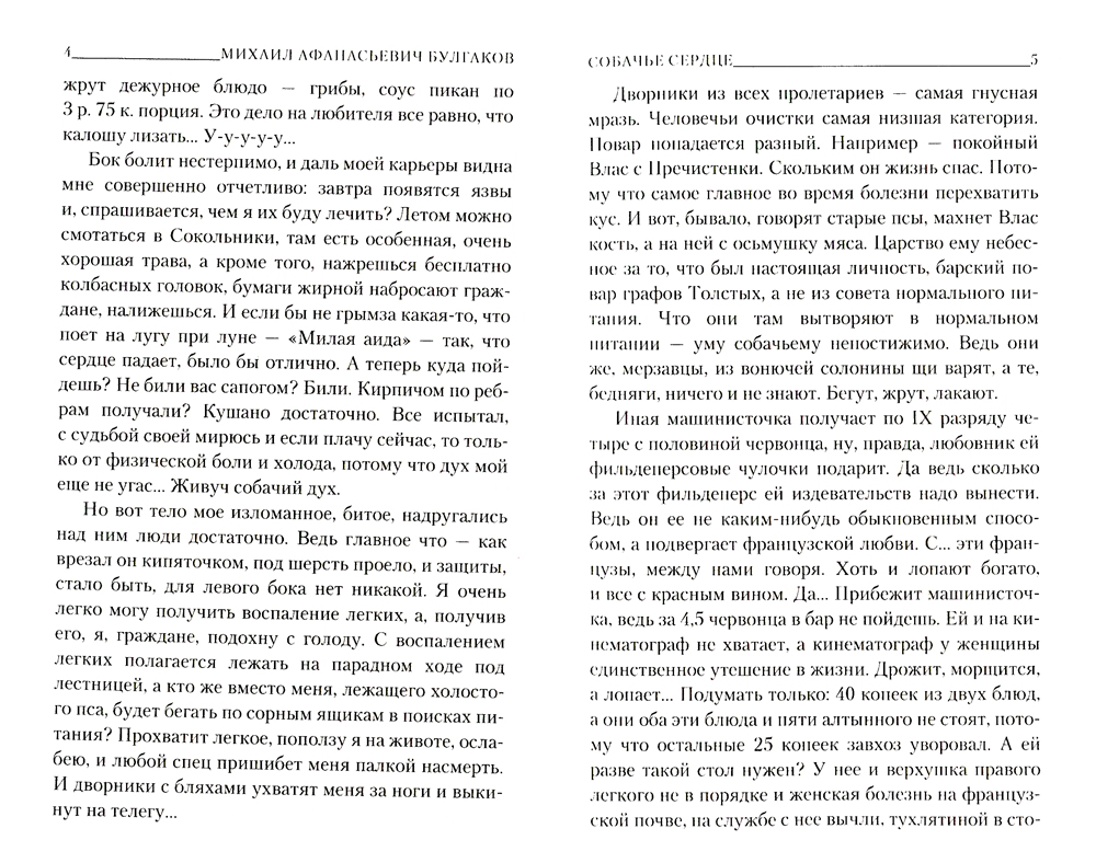 В фантастической повести Михаила Булгакова «Собачье сердце» выдающийся профессор Филипп Преображенский и его ассистент доктор Иван Борменталь ставят эксперимент по пересадке человеческих гипофиза и семенников беспородному псу Шарику, с беспризорной жизнью и мыслями которого автор знакомит читателя в самом начале произведения. Случилась оказия, ведь, казалось бы, удачное течение эксперимента свернуло к неожиданному результату: пес уж больно стал походить на человека, чьи органы ему пересадили. Внешне он сильно изменился, научился говорить и стал совершенно неуправляем. Именно в вопросе о том, как справиться с непредвиденными разрешениями ситуаций и вернуть все вспять, заключена основная идея данного произведения - может ли человек вмешиваться в естественный ход природы, или она одна знает, как правильно?| Издательство | Омега-Л |