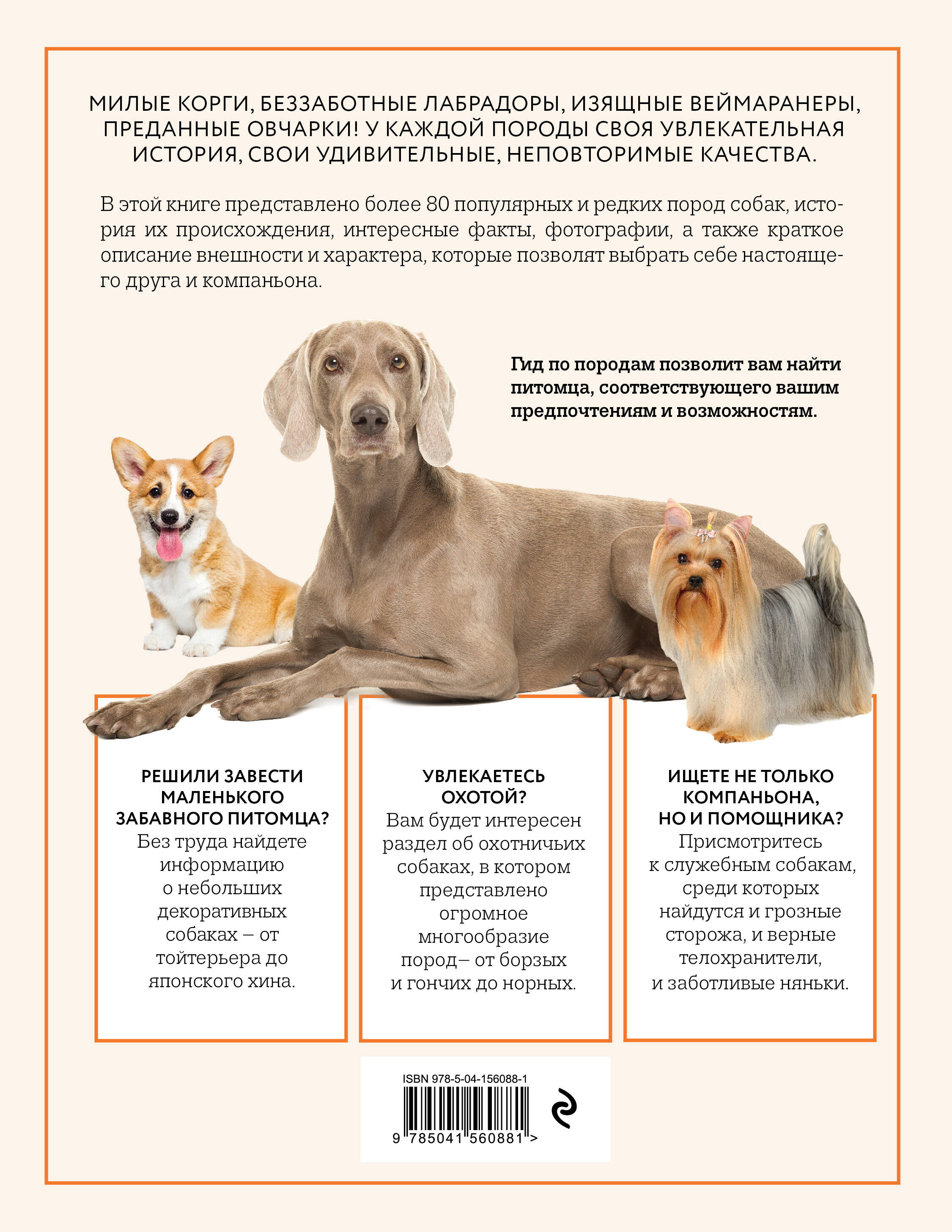 Выбрать щенка среди огромного количества пород, существующих в мире - не так просто. Ведь для комфортного сосуществования необходимо выбирать собаку, которая подойдет вам по характеру, образу жизни или интересам. Этот удобный гид поможет вам познакомиться с представителями 80 популярных и редких пород, которых можно найти у заводчиков в России. История происхождения пород, интересные факты, фотографии, а также описание внешности и характера, позволят выбрать себе настоящего друга и компаньона. Ищете не только компаньона, но и помощника? Присмотритесь к служебным собакам, среди которых найдутся и грозные сторожа, и верные телохранители, и заботливые няньки. Увлекаетесь охотой? Вам будет интересен раздел об охотничьих собаках, в котором представлено огромное многообразие пород - от борзых и гончих до норных. Решили завести маленького забавного питомца? Без труда найдете информацию о небольших декоративных собаках - от той-терьера до японского хина. В этой энциклопедии вы найдете самое важное об особенностях различных пород: крупных и миниатюрных, активных и спокойных, мохнатых и короткошерстных.| Издательство | ООО "Издательство "Эксмо" |