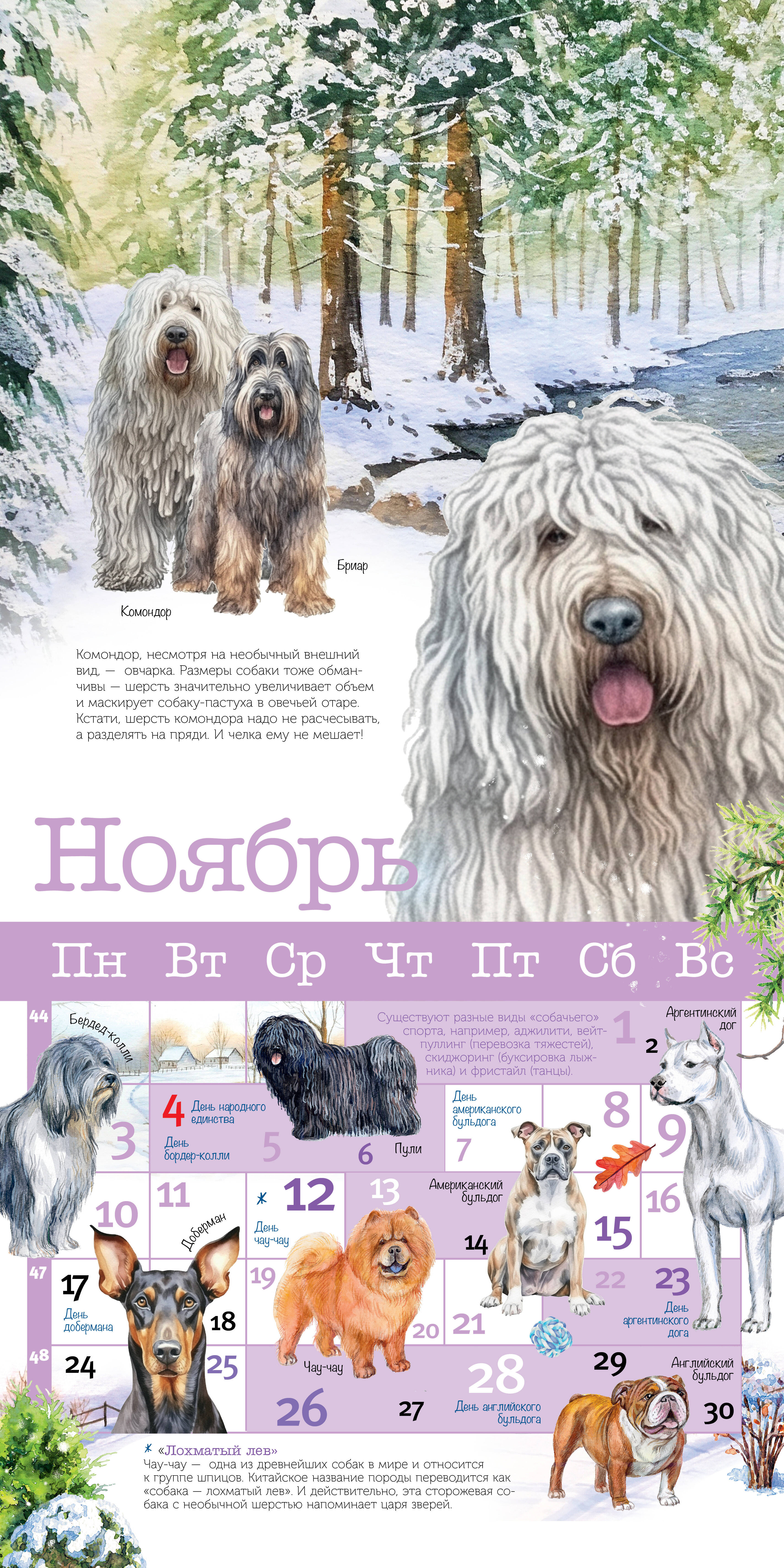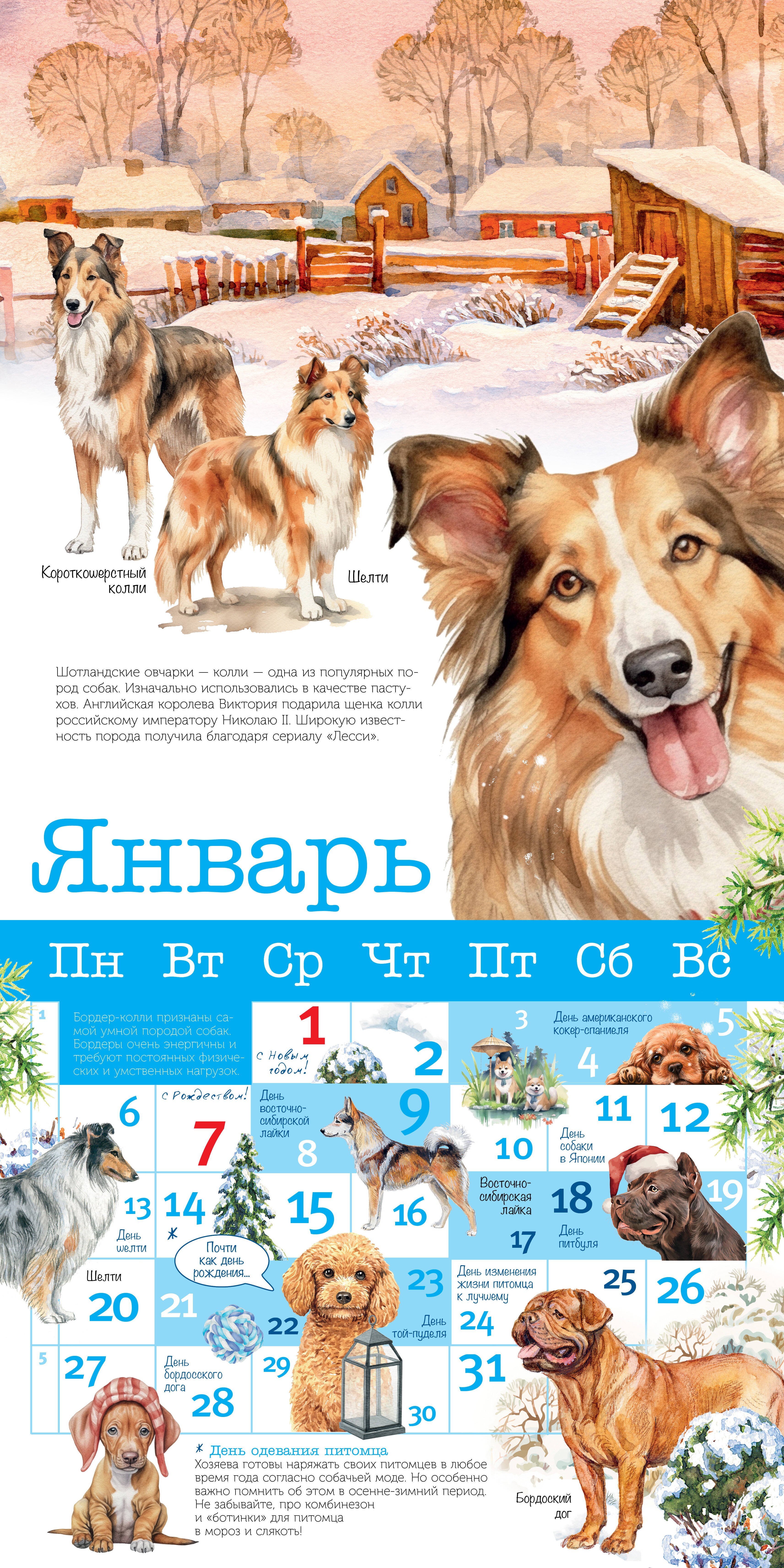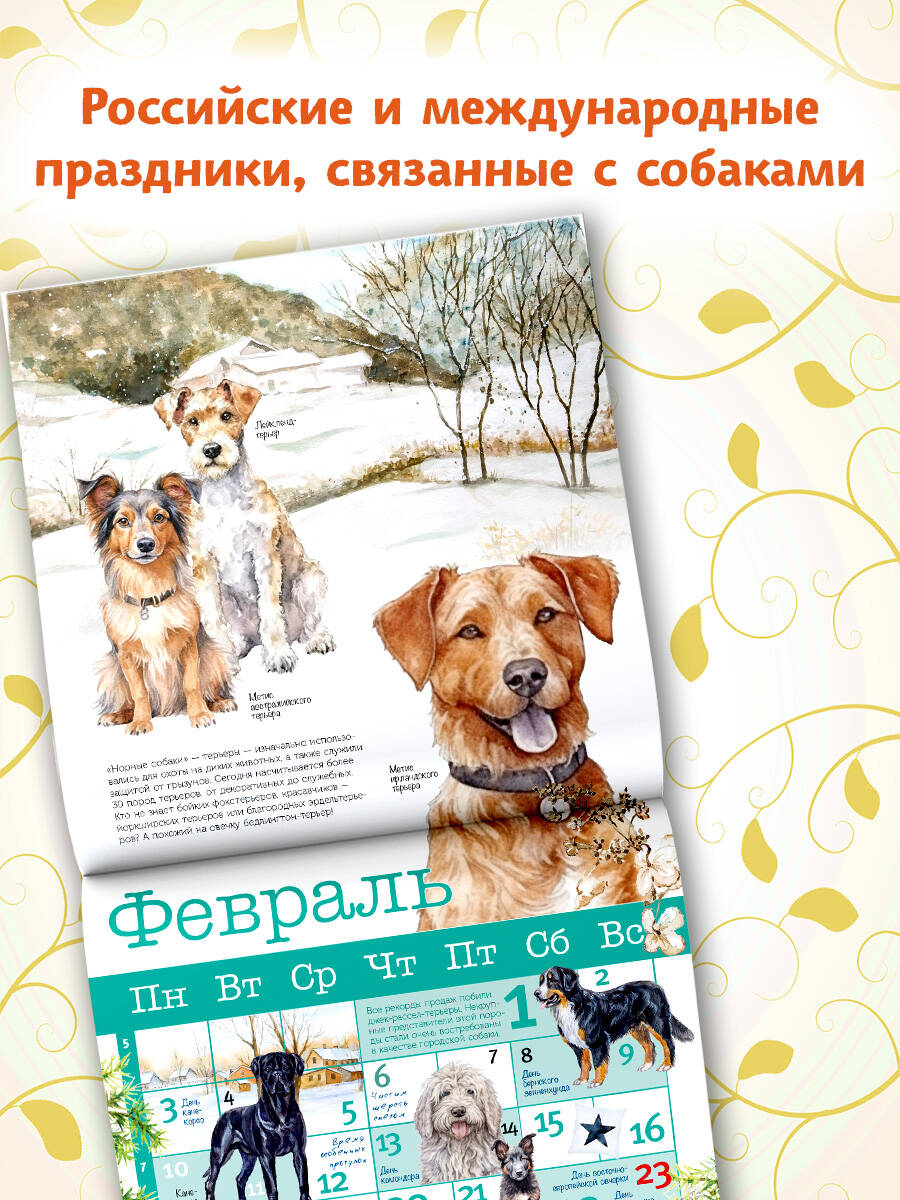 В календарь включены российские и международные праздники, связанные с собаками, день рождение каждой породы, а также забавные праздники, придуманные любителями собак в разных странах мира. Любопытная информация о породах, рассказы о собаках, будут интересны как детям, так и взрослым. Замечательные иллюстрации художников-анималистов украшают каждый календарный месяц, представляя самые разные породы, щенков и взрослых собак.