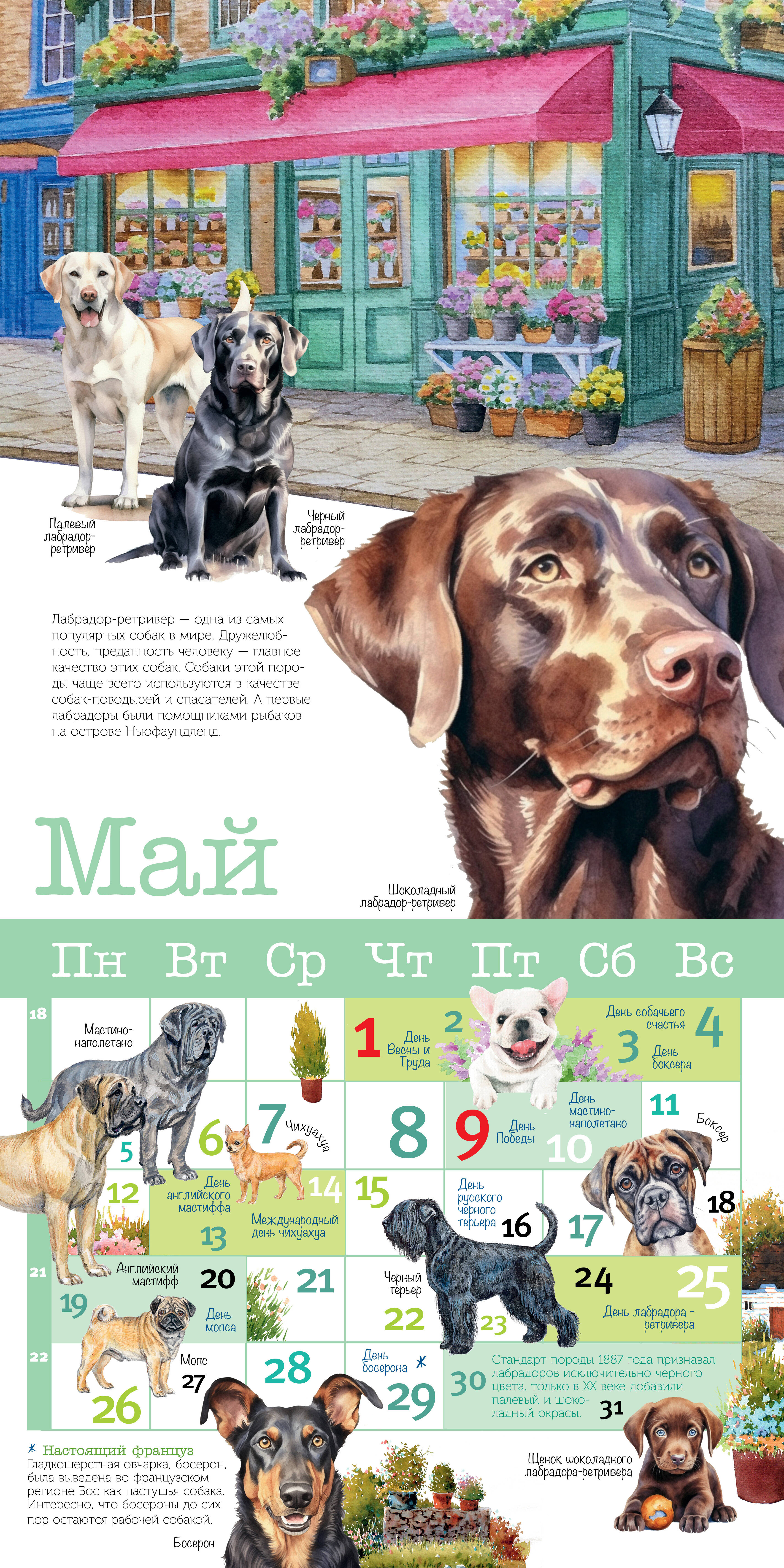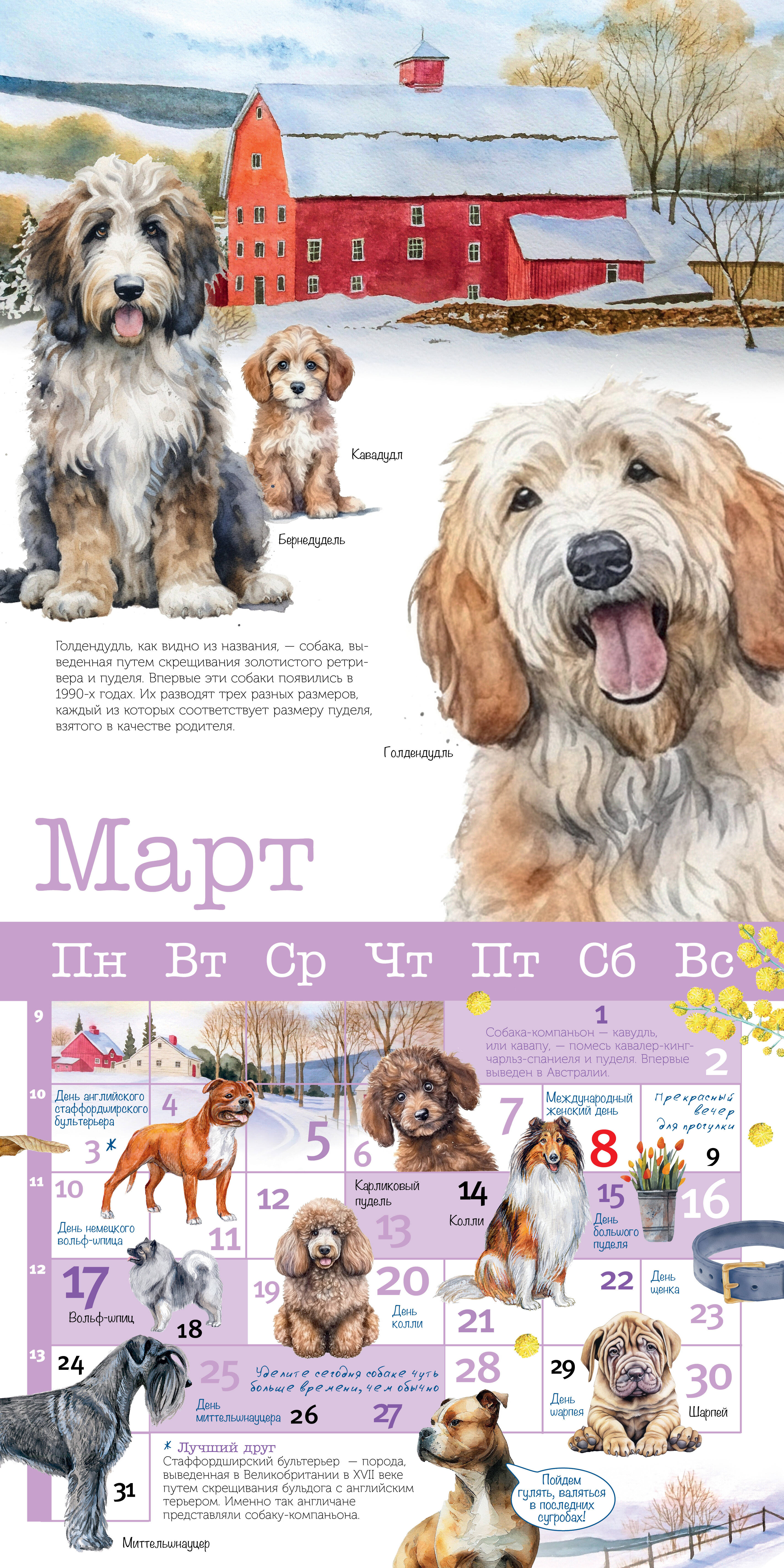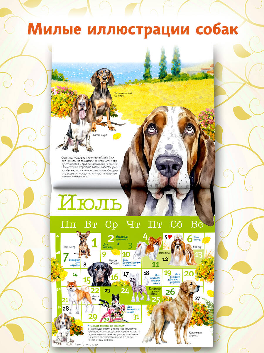 В календарь включены российские и международные праздники, связанные с собаками, день рождение каждой породы, а также забавные праздники, придуманные любителями собак в разных странах мира. Любопытная информация о породах, рассказы о собаках, будут интересны как детям, так и взрослым. Замечательные иллюстрации художников-анималистов украшают каждый календарный месяц, представляя самые разные породы, щенков и взрослых собак.