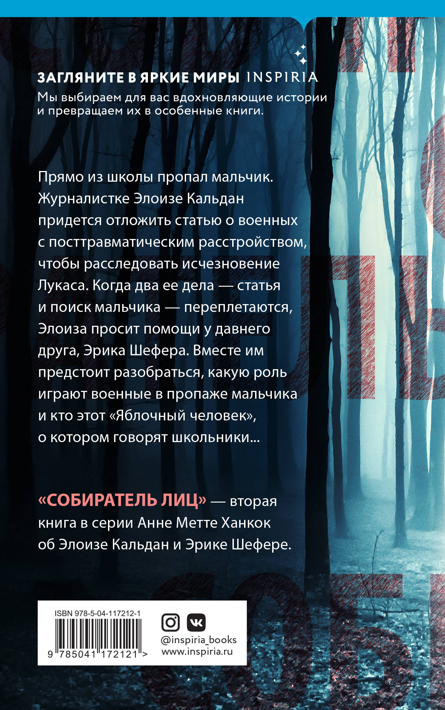 Прямо из школы пропал мальчик. Журналистке Элоизе Кальдан придется отложить статью о военных с посттравматическим расстройством, чтобы расследовать исчезновение Лукаса. Когда два ее дела - статья и поиск мальчика - переплетаются, Элоиза просит помощи у давнего друга, Эрика Шефера. Вместе им предстоит разобраться, какую роль играют военные в пропаже мальчика и кто этот «Яблочный человек», о котором говорят школьники? «Собиратель лиц» - вторая книга в серии Анне Метте Ханкок об Элоизе Кальдан и Эрике Шефере. Это по-скандинавски жесткий роман о сильных женщинах, история преступлений, мести и возмездия, которая освещает новые грани жесткого триллера и смещает фокус с фигуры мрачного небритого полицейского на обычных женщин - журналисток, следователей, программисток, которые под давлением обстоятельств и зачастую наперекор мнению окружающих выводят расследование на новый уровень.| Издательство | ООО "Издательство "Эксмо" |