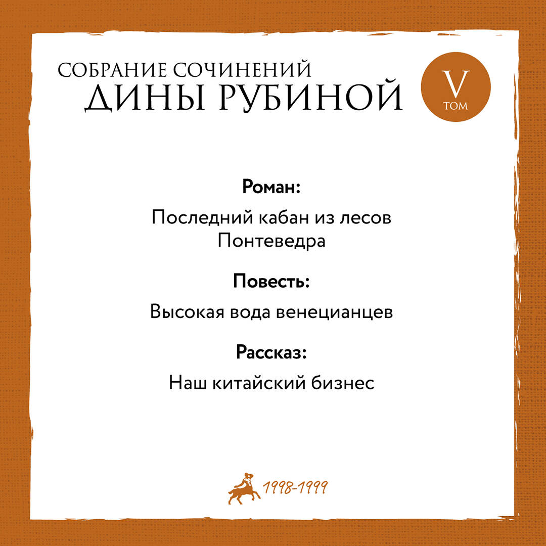 Представляем собрание сочинений Дины Рубиной. Книги, изданные и специально подготовленные издательством, - это настоящий подарок для читателя, который несомненно порадует качеством текста и оформления. В собрание сочинений включены как ранние произведения автора, так и последние по времени. Полноценная хронология, вдоль которой прослеживается эволюция писательского стиля и расширение географии событий, происходящих во вселенной Дины Рубиной. В пятый том вошла проза, написанная Рубиной с 1998 по 1999 годы: - Роман: «Последний кабан из лесов Понтеведра»; - Повесть: «Высокая вода венецианцев»; - Рассказ: «Наш китайский бизнес».| Издательство | ООО "Издательство "Эксмо" |