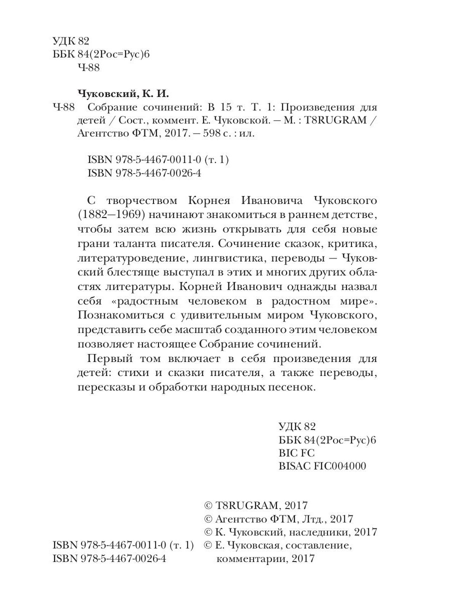 С творчеством Корнея Ивановича Чуковского (1882-1969) начинают знакомиться в раннем детстве, чтобы затем всю жизнь открывать для себя новые грани таланта писателя. Сочинение сказок, критика, литературоведение, лингвистика, переводы - Чуковский блестяще выступал в этих и многих других областях литературы. Корней Иванович однажды назвал себя «радостным человеком в радостном мире». Познакомиться с удивительным миром Чуковского, представить себе масштаб созданного этим человеком позволяет настоящее Собрание сочинений. Первый том включает в себя произведения для детей: стихи и сказки писателя, а также переводы, пересказы и обработки народных песенок.| Издательство | Т8 RUGRAM |