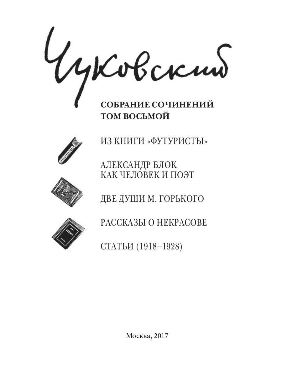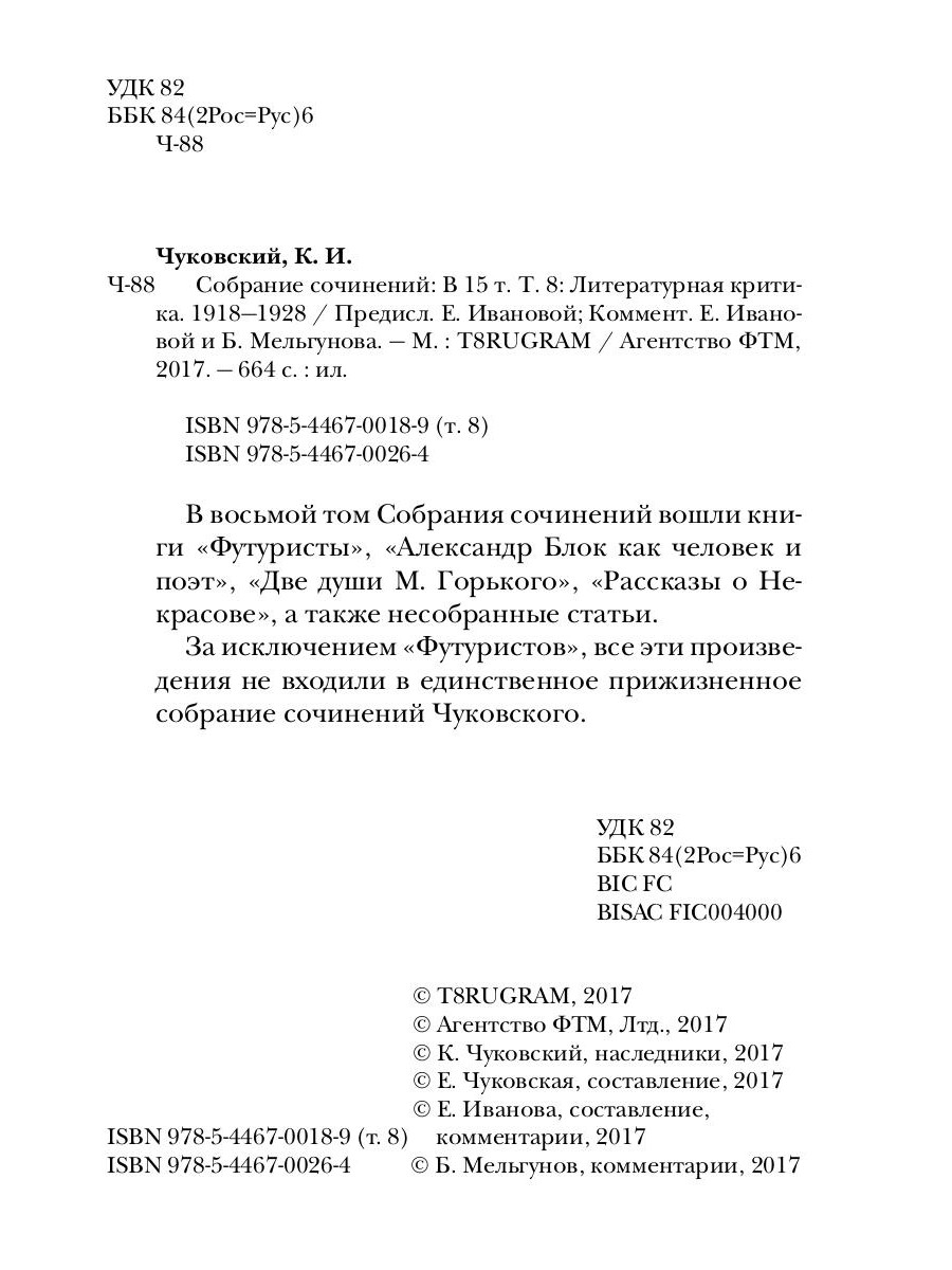 В восьмой том Собрания сочинений вошли книги «Футуристы», «Александр Блок как человек и поэт», «Две души М. Горького», «Рассказы о Некрасове», а также несобранные статьи. За исключением «Футуристов», все эти произведения не входили в единственное прижизненное собрание сочинений Чуковского.| Издательство | Т8 RUGRAM |