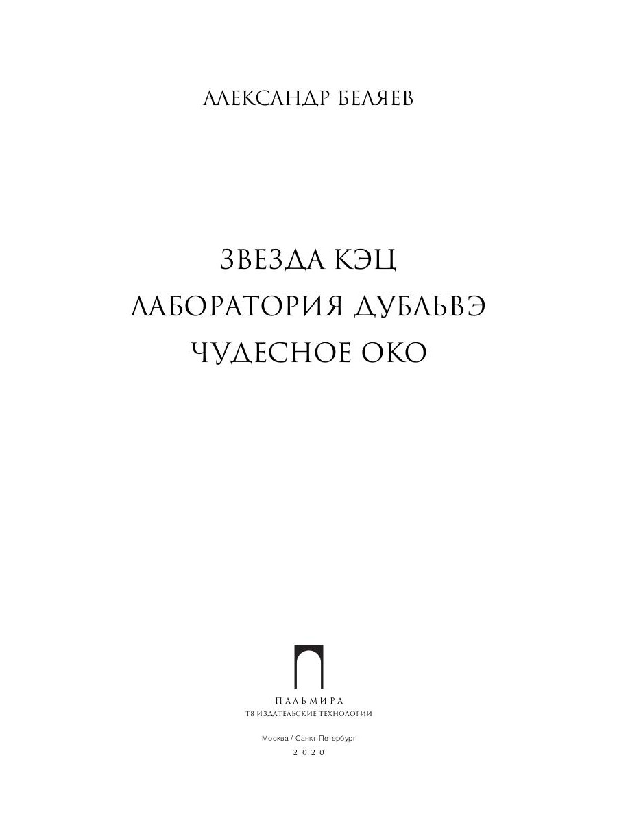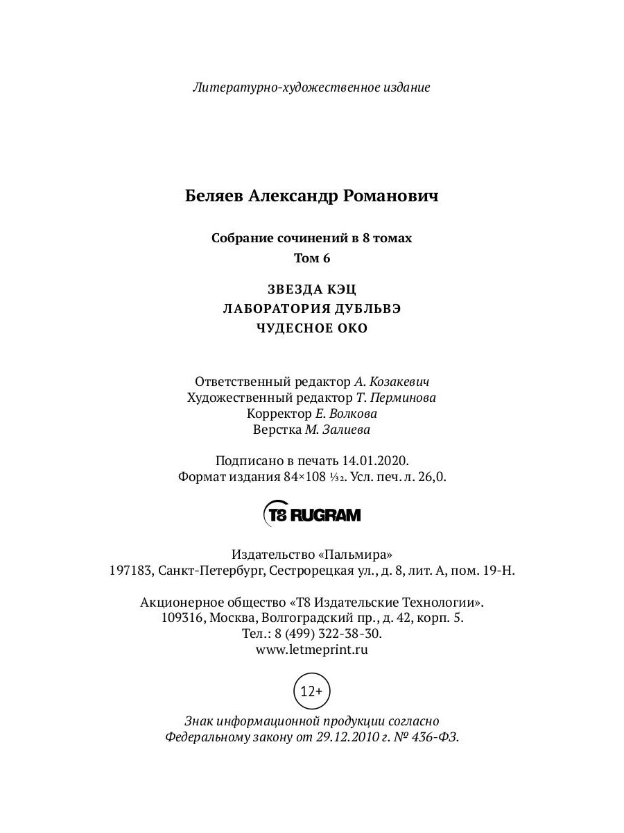В шестой том собрания сочинений знаменитого фантаста А. Р. Беляева вошли три романа: «Звезда КЭЦ» (1936), посвященный памяти К. Э. Циолковского, «Лаборатория Дубльвэ» (1938) о проблемах продления жизни и «Чудесное око» (1935) о ценности уникальных для цивилизации открытий.| Издательство | Т8 RUGRAM |