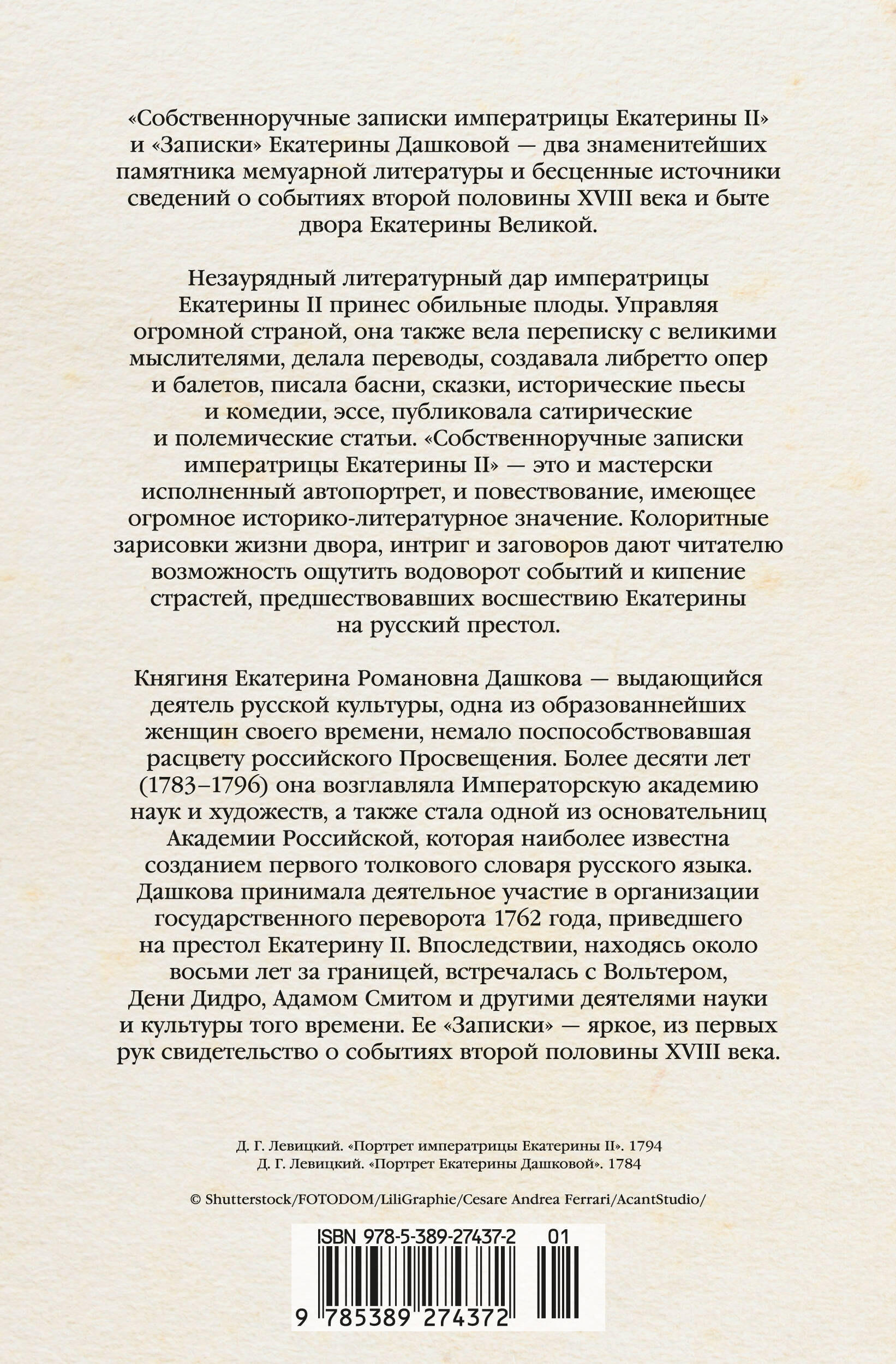 "Собственноручные записки императрицы Екатерины II" и "Записки" Екатерины Дашковой - два знаменитейших памятника мемуарной литературы и бесценные источники сведений о событиях второй половины XVIII века и быте двора Екатерины Великой. Незаурядный литературный дар императрицы Екатерины II принес обильные плоды. Управляя огромной страной, она также вела переписку с великими мыслителями, делала переводы, создавала либретто опер и балетов, писала басни, сказки, исторические пьесы и комедии, эссе, публиковала сатирические и полемические статьи. "Собственноручные записки императрицы Екатерины II" - это и мастерски исполненный автопортрет, и повествование, имеющее огромное историко-литературное значение. Колоритные зарисовки жизни двора, интриг и заговоров дают читателю возможность ощутить водоворот событий и кипение страстей, предшествовавших восшествию Екатерины на русский престол. Княгиня Екатерина Романовна Дашкова - выдающийся деятель русской культуры, одна из образованнейших женщин своего времени, немало поспособствовавшая расцвету российского Просвещения. Более десяти лет (1783-1796) она возглавляла Императорскую академию наук и художеств, а также стала одной из основательниц Академии Российской, которая наиболее известна созданием первого толкового словаря русского языка. Дашкова принимала деятельное участие в организации государственного переворота 1762 года, приведшего на престол Екатерину II. Впоследствии, находясь около восьми лет за границей, встречалась с Вольтером, Дени Дидро, Адамом Смитом и другими деятелями науки и культуры того времени. Ее "Записки" - яркое, из первых рук свидетельство о событиях второй половины XVIII века.| Издательство | Азбука-Аттикус Издат.группа ООО |