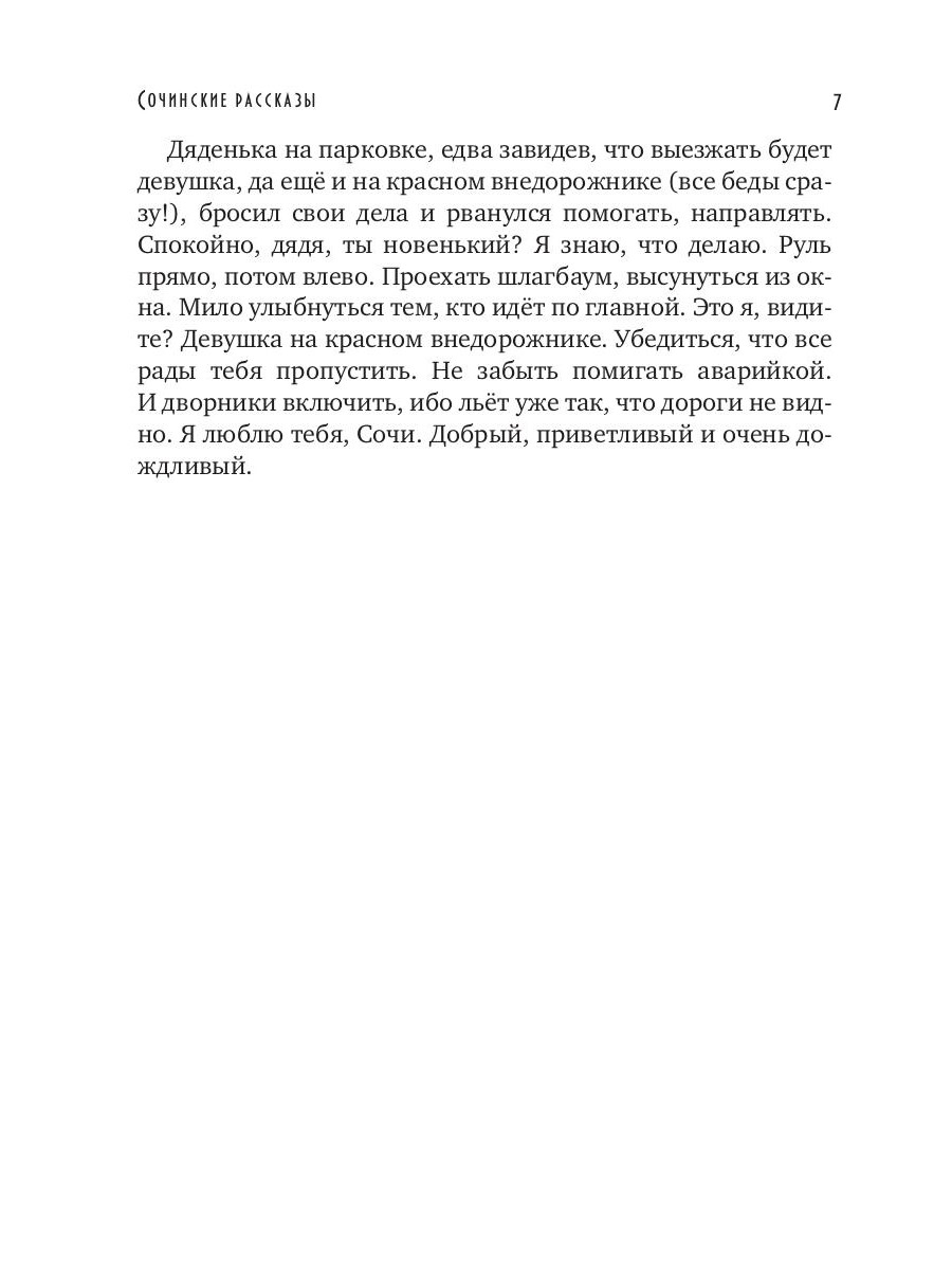 Все хотят в Сочи на три ночи. Особенно в сезон. Но если ты приехал не на три дня, а насовсем, тебе откроется совершенно другой город. С маленькими уютными магазинчиками, где продавщица, отпуская тебе мясо, поделится рецептами его приготовления. С извилистыми горными дорогами, по которым гоняет дядя Сосо на своём битом тазике, и каждая поездка с ним превращается в увлекательное приключение. С тихими пляжами для местных и совершенно особыми достопримечательностями, которые не показывают отдыхающим. Сочи, который скрывается под этой обложкой, вас точно удивит. А с его жителями вы наверняка захотите познакомиться, когда приедете в следующий раз. Телефончик дяди Сосо я вам дам, обращайтесь.| Издательство | Т8 RUGRAM |