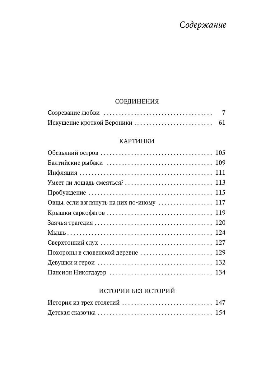 В эту книгу, помимо сборника новелл «Соединения» - о женщинах, постигающих себя и свои любовные чувства, в котором автору удается осуществить художественный эксперимент, практически полностью сняв разграничение между внешним миром и ощущениями персонажей, вошли маленькие истории и размышления, напоминающие предвидение, облеченное в образы. Подобные предсказания удаются тому, кто наблюдает жизнь людей в мелких ее проявлениях, кажущихся недостойными внимания, и отдается во власть ощущений, которые безыскусно выражают себя в том, что мы делаем и чем себя окружаем. В этих «Картинках» и «Историях без историй» проглядывает язвительность, свойственная газетным сатирическим зарисовкам. Эта критика малых ошибок не теряет своей ценности и во времена, когда уже совершены неизмеримо большие ошибки.