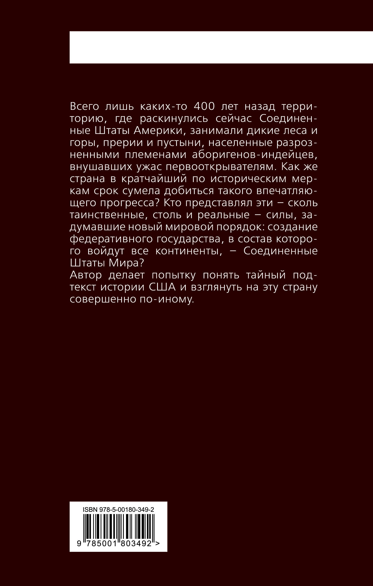 Всего лишь какие-то 400 лет назад территорию, где раскинулись сейчас Соединенные Штаты Америки, занимали дикие леса и горы, прерии и пустыни, населенные разрозненными племенами аборигенов-индейцев, внушающих ужас первооткрывателям. Как же страна в кратчайший по историческим меркам срок сумела добиться такого впечатляющего прогресса? Кто представлял эти - сколь таинственные, столь и реальные - силы, задумавшие новый мировой порядок: создание федеративного государства, в состав которого войдут все континенты, - Соединенные Штаты Мира? Автор делает попытку понять тайный подтекст истории США и взглянуть на эту страну совершенно по-иному.