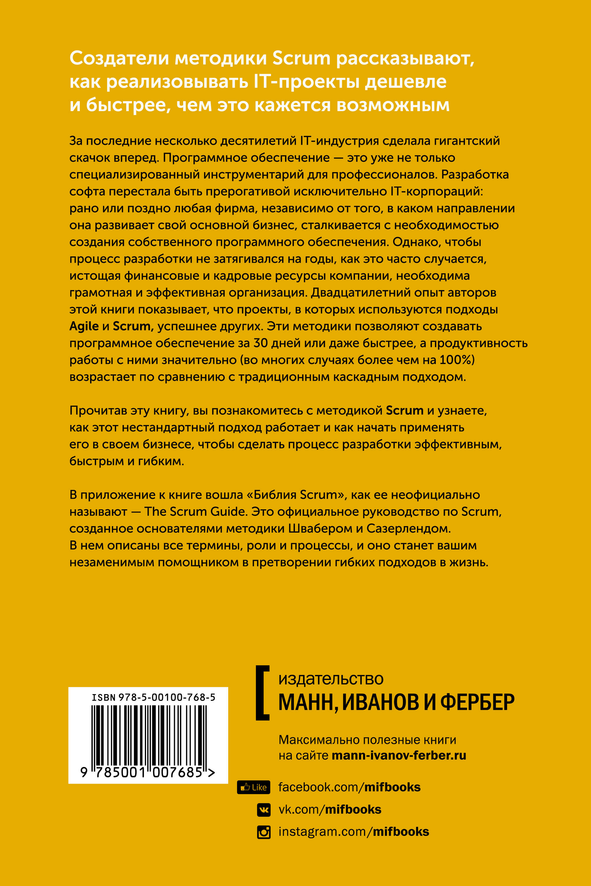 Создатели методики Scrum рассказывают, как реализовывать IT-проекты дешевле и быстрее, чем это кажется возможным. Прочитав эту книгу, вы познакомитесь с методикой Scrum и узнаете, как этот нестандартный подход работает и как начать применять его в своем бизнесе, чтобы сделать процесс разработки эффективным, быстрым и гибким.| Издательство | МАНН, ИВАНОВ И ФЕРБЕР ООО |