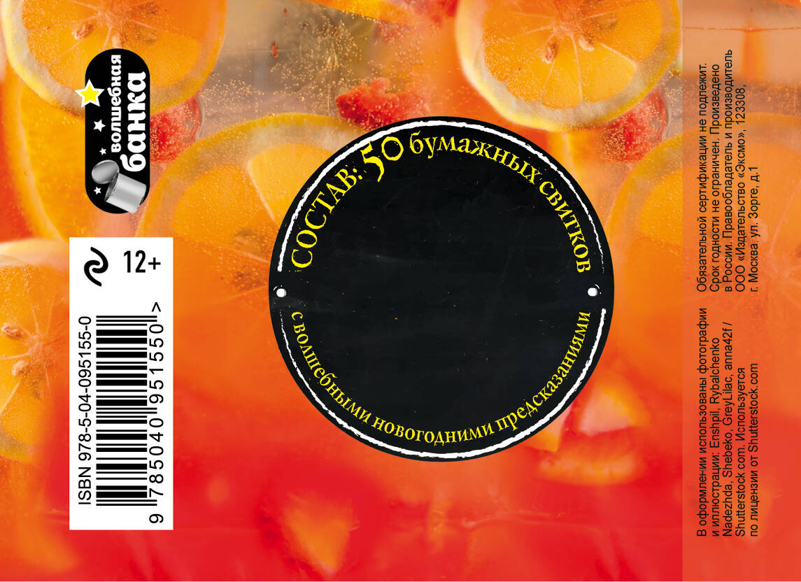 Если вы хотите добавить новогодней ночи магии и волшебства - эта банка для вас! Подарите своим родным и близким возможность заглянуть в будущее, полное приятных сюрпризов. Под крышкой собраны добрые и душевные предсказания о счастье, любви, дружбе, здоровье и успехах в делах. Вытягивайте по очереди бумажки с предсказаниями и читайте вслух. Атмосфера чуда и хорошее настроение гарантированы! Какие, например, предсказания могут вас ждать? • Вот это да! В наступающем году во всех сферах жизни вам будет сопутствовать удача. Действуйте, у вас все получится! • Готовьтесь к году потрясающих открытий! Не бойтесь пробовать новое - от прически до знакомств и маршрутов для путешествий - вот ваш путь к вдохновению и потрясающим перспективам. • В наступающем году настоящее вдохновение придет к вам от родных. Старайтесь проводить как можно больше времени с семьей. Совместные просмотры фильмов, прогулки и поездки загород станут источником гармонии и счастья.| Издательство | ООО "Издательство "Эксмо" |