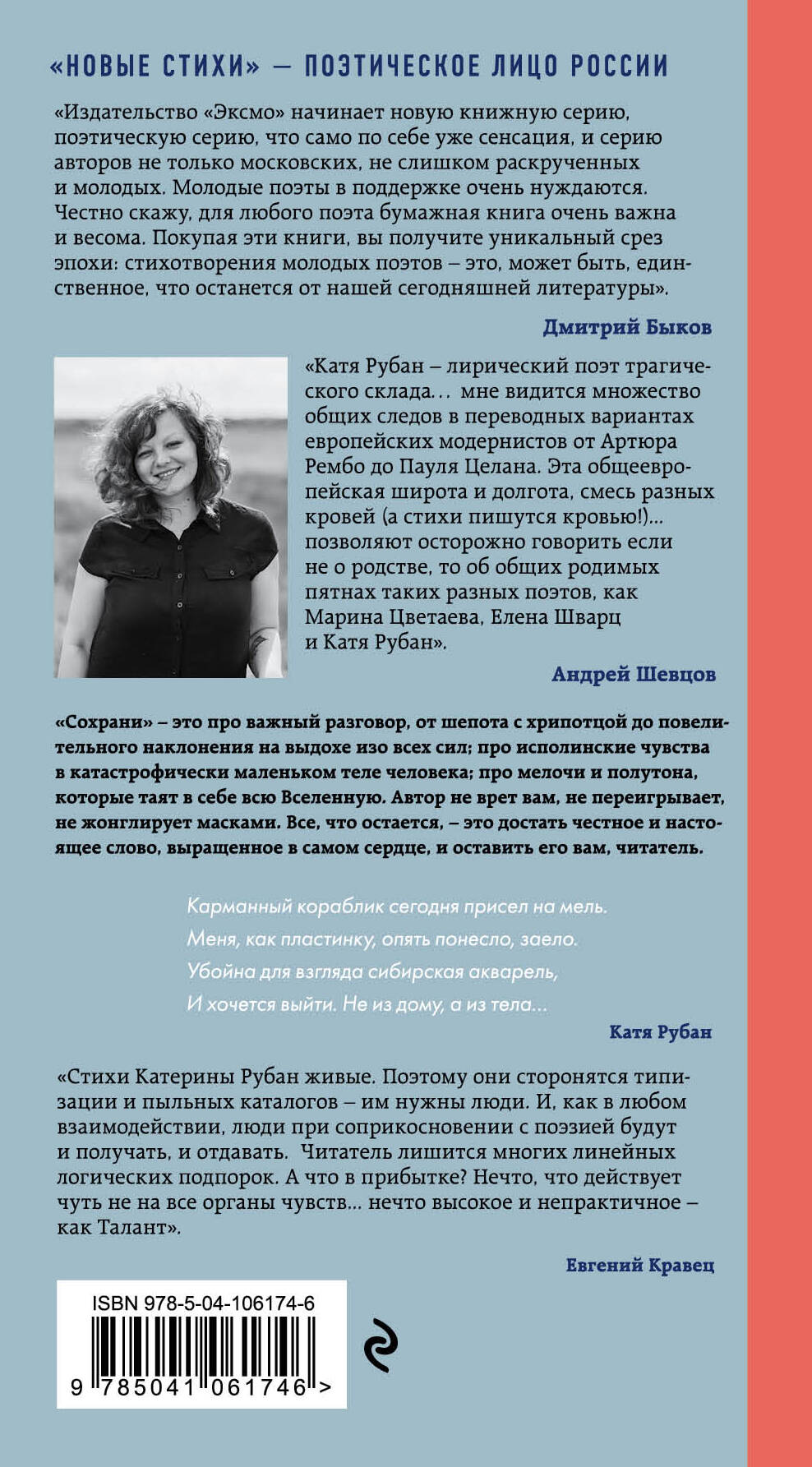 "Книга стихотворений "Сохрани" - это разговор с теми, кто рядом со мной и кого больше нет. В суете повседневной жизни важные слова мы откладываем на потом, думая, что когда-то для них настанет время и место. Но этого, чаще всего, не происходит. Люди идут в нас, живут в нас, проходят сквозь, проходят мимо. Жизнь течет, мы отражаемся в ней кем-то не тем, пытаемся разгадать самих себя и храним молчание. "Сохрани" - книга экспериментов, разговор начистоту, мое настоящее лицо, которое было стыдно и страшно показать. Это крик в темноту, за которой, я верю, настанет свет. Он уже здесь". Катя Рубан "Сохрани меня страстной и слишком очеловеченной. По живому - живым. Позабудь про жестокий век. Если будет любовь, то пускай она будет вечная".| Издательство | ООО "Издательство "Эксмо" |