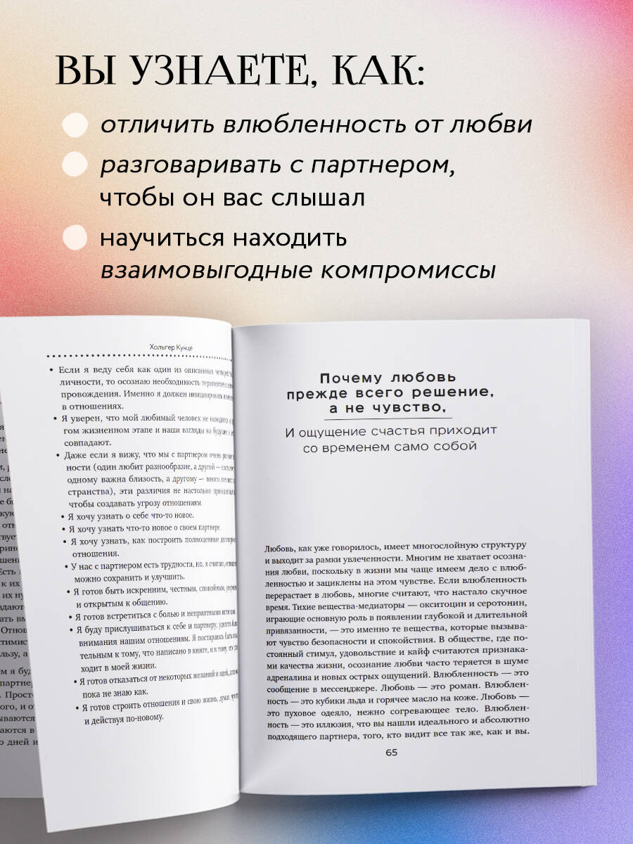 «Влюбленность - это сообщение в мессенджере. Любовь - это роман». Немецкий семейный психотерапевт Хольгер Кунце проделал большой путь в карьере длиной двадцать лет, чтобы выяснить, как сохранить баланс в отношениях, основанных не только на романтической влюбленности, но и прагматичной рациональности. В своей книге он раскрывает суть этого симбиоза, доказывая, что даже любовь может быть осознанной. Эта книга объяснит: - в чем разница между влюбленностью и любовью; - как определить тип личности партнера и на основании этого построить отношения (или расстаться); - как прийти к взаимопониманию благодаря компромиссам; - почему союз двух людей - величайшее испытание в жизни и почему не нужно бояться любить. Благодаря этой книге вы поймете, что любовь - это прежде всего решение, а не чувство, и научитесь это решение принимать.| Издательство | ООО "Издательство "Эксмо" |
