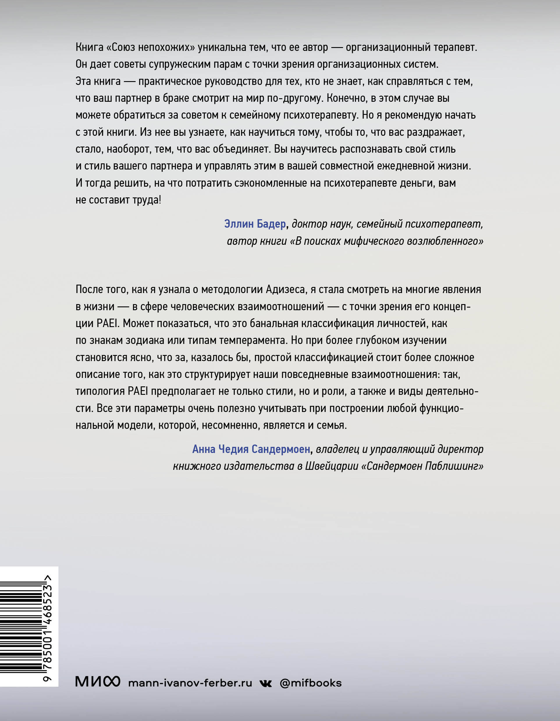 И организации, и семьи являются системами. Для успешной работы системы, которой является брак, необходима реализация четырех ролей. Во-первых, выполнение множества обязанностей: забота друг о друге, уход за домом и детьми, обеспечение необходимого семье дохода и т. п. Являясь системой, семья нуждается в дисциплине и правилах - иначе в ней не будет порядка. Порядок должен меняться в зависимости от обстоятельств, поскольку брак - это выбор на долгие годы, и с течением времени, чтобы оставаться функциональным, он должен эволюционировать. И, наконец, в семье должны царить единство и согласие, основанные на близости, взаимовыручке и... любви. Итак, в семье должны реализовываться четыре различных роли, для того чтобы все эти действия стали возможными: Производство результатов (Production - P), Администрирование (Administration - A), Предпринимательство (Enterpreneurship - E) и Интегрирование (Integration - I), которые и составляют аббревиатуру PAEI. В случае, когда одна или несколько ролей не исполняются, в браке станет чего-то не хватать, и он рискует разбиться о камни. Все четыре роли PAEI не могут быть совмещены друг с другом одновременно, и никто одновременно не может исполнять их в одиночку. Таким образом, брак представляет собой взаимодополняющую команду, где один из партнёров берёт на себя одну часть ролей, а другой - оставшуюся. Это объясняет то, почему противоположности притягиваются. Беда в том, что, когда вместе собираются люди с несхожими стилями поведения, среди них возникают конфликты. Конфликт может перейти в деструктивную фазу и привести к разводу. А может помочь дальнейшему развитию и самореализации. Зависит это от того, присутствуют ли в семье взаимоуважение и доверие. Это книга о взаимоуважении и доверии и о том, как их развивать и пестовать в своей семье. Из предисловия Ицхака Адизеса: Многие годы, что я работаю с сотнями компаний и тысячами руководителей, в своих отзывах клиенты говорят мне, что они применяют методологию Адизеса, которой мы научили их на консультациях, и в своей семейной жизни. Люди отмечают, что она меняет к лучшему их отношения в семьях. Некоторые даже считают, что она спасла их брак. Я имею в виду обычные сложности взаимопонимания и прочее, с чем каждый сталкивается в браке, а не проблемы, к которым приводят личные психологические недостатки, требующие отдельного профессионального вмешательства. Меня попросили написать книгу о том, как методология Адизеса применима к семейной жизни. Проблема в том, что у меня совсем нет на это времени. Годами я напряженно тружусь, консультируя крупные корпорации и лидеров государств по всему миру. Когда же мне было писать подобную книгу? По удачному стечению обстоятельств Иехезкель и Рут Маданесы увлеклись моей теорией и попросили разрешения написать книгу по использованию кода стилей руководства PAEI по Адизесу к эннеаграммам, являющимся их собственной специализацией. Я дал согласие, и их книга была опубликована и переведена на три языка. Затем я узнал, что они не только учат применять эннеаграммы. На основе эннеаграмм они проводят семейные тренинги и тренинги отношений. "А почему бы вам не попробовать использовать так же и теорию Адизеса?" - спросил их я. Идея им очень понравилась, и так зародилась эта книга. Для кого эта книга: Для каждого, кто хочет укрепить свою семью.| Издательство | МАНН, ИВАНОВ И ФЕРБ