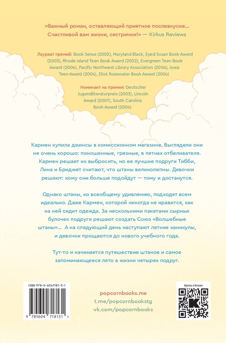 Кармен купила джинсы в комиссионном магазине. Выглядели они не очень хорошо: поношенные, грязные, в пятнах отбеливателя. Кармен решает их выбросить, но ее лучшие подруги Тибби, Лина и Бриджет считают, что штаны великолепны. Девочки решают: кому они больше подойдут - тому и достанутся. Однако штаны, ко всеобщему удивлению, подходят всем идеально. Даже Кармен, которой никогда не нравится, как на ней сидит одежда. За несколькими пакетами сырных булочек подруги решают создать Союз «Волшебные Штаны»... А на следующий день наступают летние каникулы, и девочки прощаются до нового учебного года. Тут-то и начинается путешествие штанов и самое запоминающееся лето в жизни четырех подруг.| Издательство | ПОПКОРН БУКС ООО |