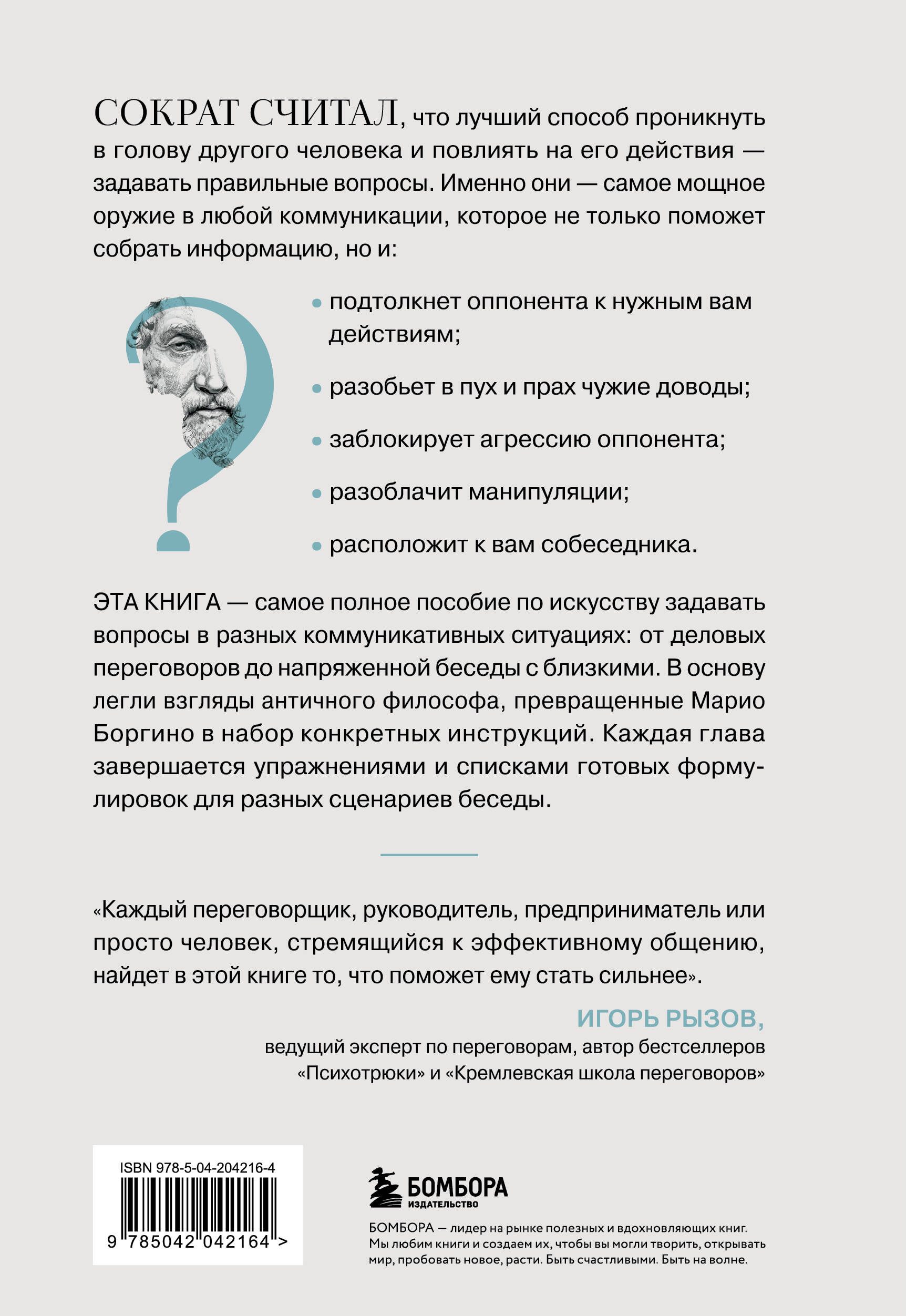 Сократ считал, что лучший способ проникнуть в голову другого человека и повлиять на его действия - задавать правильные вопросы. Именно они - самое мощное оружие в любой коммуникации, которое не только поможет собрать информацию, но и: - подтолкнет оппонента к нужным вам действиям; - разобьет в пух и прах чужие доводы; - заблокирует агрессию оппонента; - разоблачит манипуляции; - расположит к вам собеседника. Эта книга - самое полное пособие по искусству задавать вопросы в разных коммуникативных ситуациях. От деловых переговоров до напряженной беседы с близким человеком. В основу легли взгляды античного философа, превращенные Марио Боргино в набор конкретных инструкций. Каждая глава завершается упражнениями и списками готовых формулировок для разных сценариев беседы. Сократовский метод - единственный способ проникнуть в сознание другого человека. Овладейте искусством задавать вопросы и ваша жизнь измениться навсегда.| Издательство | ООО "Издательство "Эксмо" |