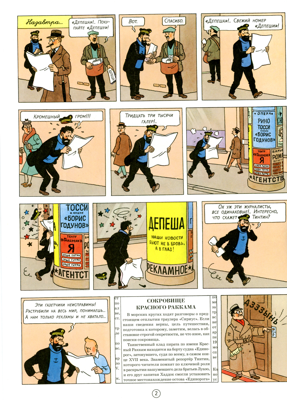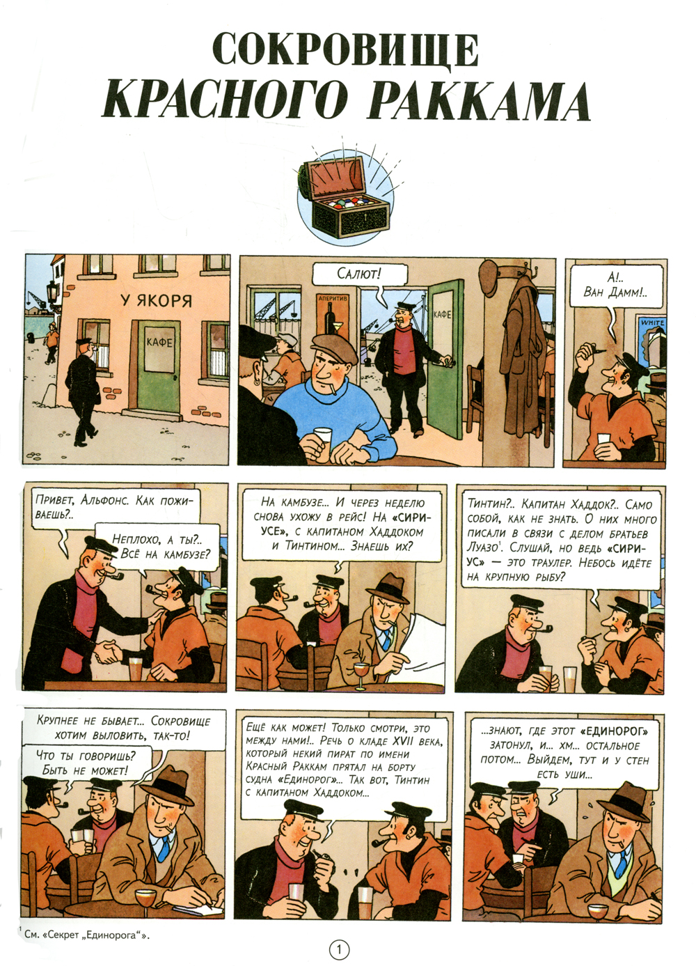 «Приключения Тинтина» - известная во всём мире серия комиксов бельгийского художника Жоржа Реми, работавшего под псевдонимом Эрже. Рискуя жизнью, отважный репортёр Тинтин расследует загадочные происшествия, но из любых передряг выходит победителем. И всегда рядом с ним его верный друг - белоснежный фокстерьер Милу. Тинтин и капитан Хаддок фрахтуют траулер «Сириус», чтобы отправиться на поиски несметных сокровищ грозного пирата по имени Красный Раккам. Похоже, драгоценности всё ещё находятся на борту фрегата «Единорог», затонувшего в конце XVII века вблизи маленького тропического острова. Тинтину удалось расшифровать старинные пергамента шевалье Франсуа де Аддока, предка капитана Хаддока, и установить точные координаты места, где произошло крушение. На борт «Сириуса» проникает чудаковатый профессор Трифон Турнесоль со своим новым изобретением - миниатюрной подводной лодкой. Туговатый на ухо профессор страшно раздражает капитана, но именно Турнесолю суждено сыграть в предстоящей экспедиции ключевую роль...