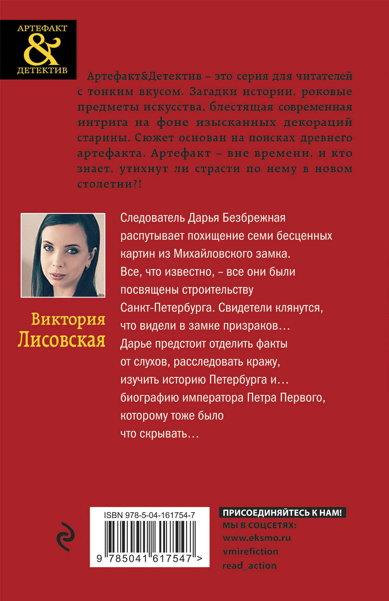 Судьба сокровищ ордена Тамплиеров, картин Эрмитажа и тайна Петра Первого в новинке Виктории Лисовской из серии «Артефакт@детектив»! Следователь Дарья Безбрежная распутывает похищение семи бесценных картин из Михайловского замка. Все, что известно - все они были посвящены строительству Санкт-Петербурга. Свидетели клянутся, что видели в замке призраков… Дарье предстоит отделить факты от слухов, расследовать кражу, изучить историю Петербурга и… биографию императора Петра Первого, которому тоже было что скрывать…| Издательство | Эксмо |