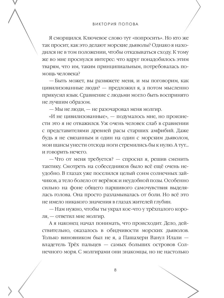 Где-то среди островов Вечного океана томится пленница трёхпалого короля - полурусалка. Её жизнь тягостна, но всегда в ней жила надежда на освобождение. Жила до тех пор, пока кто-то не стал подсыпать яд в её еду. И она решила - пусть так! Лучше смерть, чем жизнь вдали от моря, её души. А морскому собирателю ценностей, а проще говоря вору, в один прекрасный день перестаёт везти. И он просыпается, обнаружив себя связанным и подвешенным за ноги на заброшенном корабле. Что это - ошибка, или крутой поворот судьбы? Ответ ему дадут морские дьяволы, которым вдруг захотелось нанять его.| Издательство | Т8 RUGRAM |