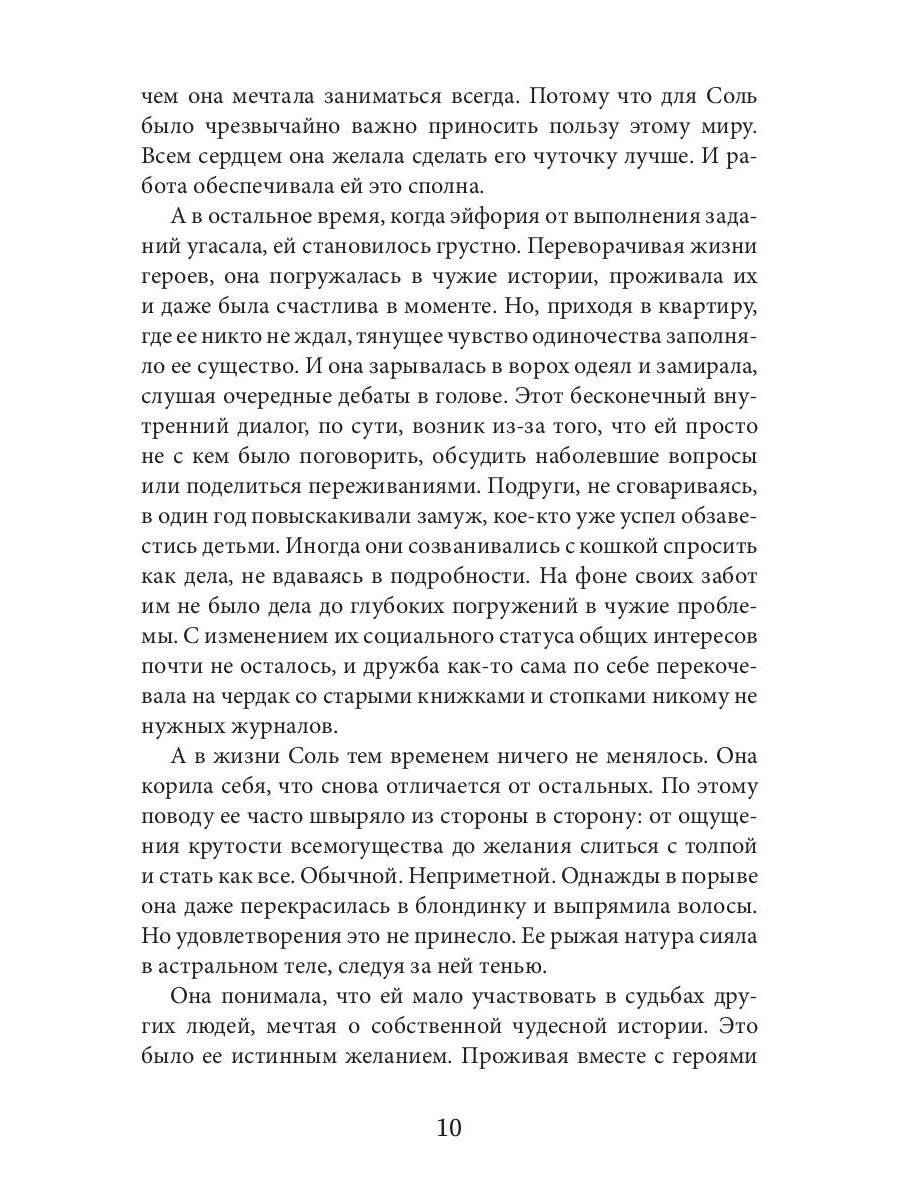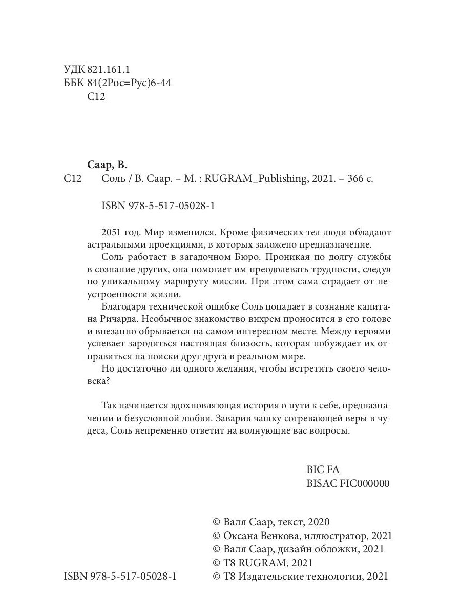 2051 год. Мир изменился. Кроме физических тел люди обладают астральными проекциями, в которых заложено предназначение. Соль работает в загадочном Бюро. Проникая по долгу службы в сознание других, она помогает им преодолевать трудности, следуя по уникальному маршруту миссии. При этом сама страдает от неустроенности жизни. Благодаря технической ошибке Соль попадает в сознание капитана Ричарда. Необычное знакомство вихрем проносится в его голове и внезапно обрывается на самом интересном месте. Между героями успевает зародиться настоящая близость, которая побуждает их отправиться на поиски друг друга в реальном мире. Но достаточно ли одного желания, чтобы встретить своего человека? Так начинается вдохновляющая история о пути к себе, предназначении и безусловной любви. Заварив чашку согревающей веры в чудеса, Соль непременно ответит на волнующие вас вопросы.| Издательство | Т8 RUGRAM |