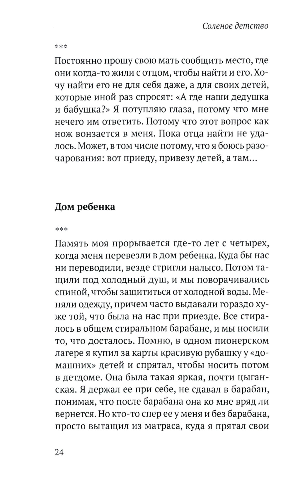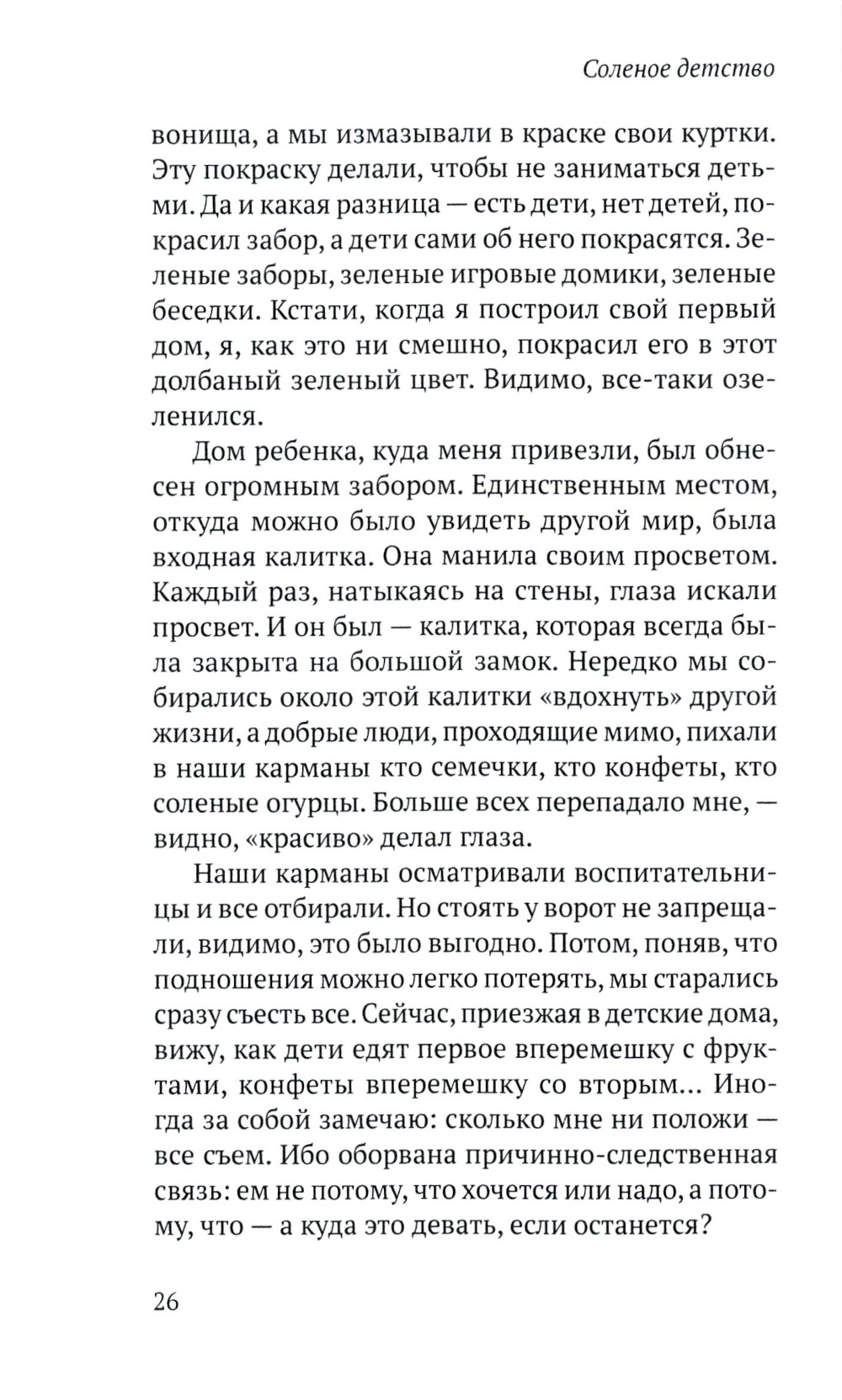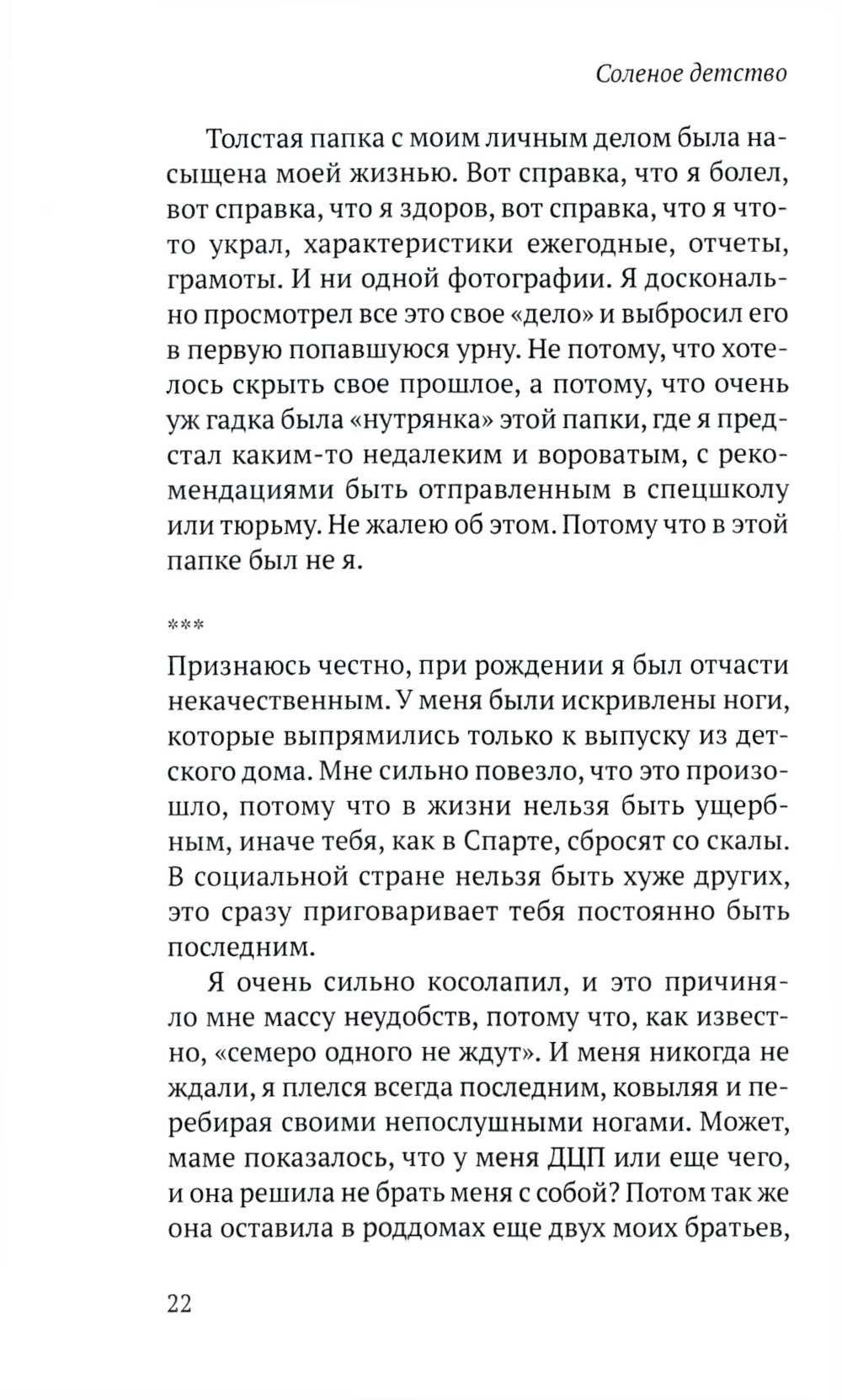 Книга «Соленое детство» написана детдомовцем Александром Гезаловым, человеком, как он сам о себе говорит, «с ампутированным детством». Он смог преодолеть невероятные трудности, не попал в тюрьму и не спился, причем не только сумел уйти из «подвалов общества», но и создал организацию, которая активно помогает детям-сиротам, осужденным, лицам без определенного места жительства. Спустя годы после выхода из детского дома автор возвращается в сиротское детство, чтобы помочь другим. В книге от первого лица рассказывается о любви и ненависти, добре и зле, о боли и пути человека, который смог выбраться из колеи и стать собой.| Издательство | Изд. НИКЕЯ |