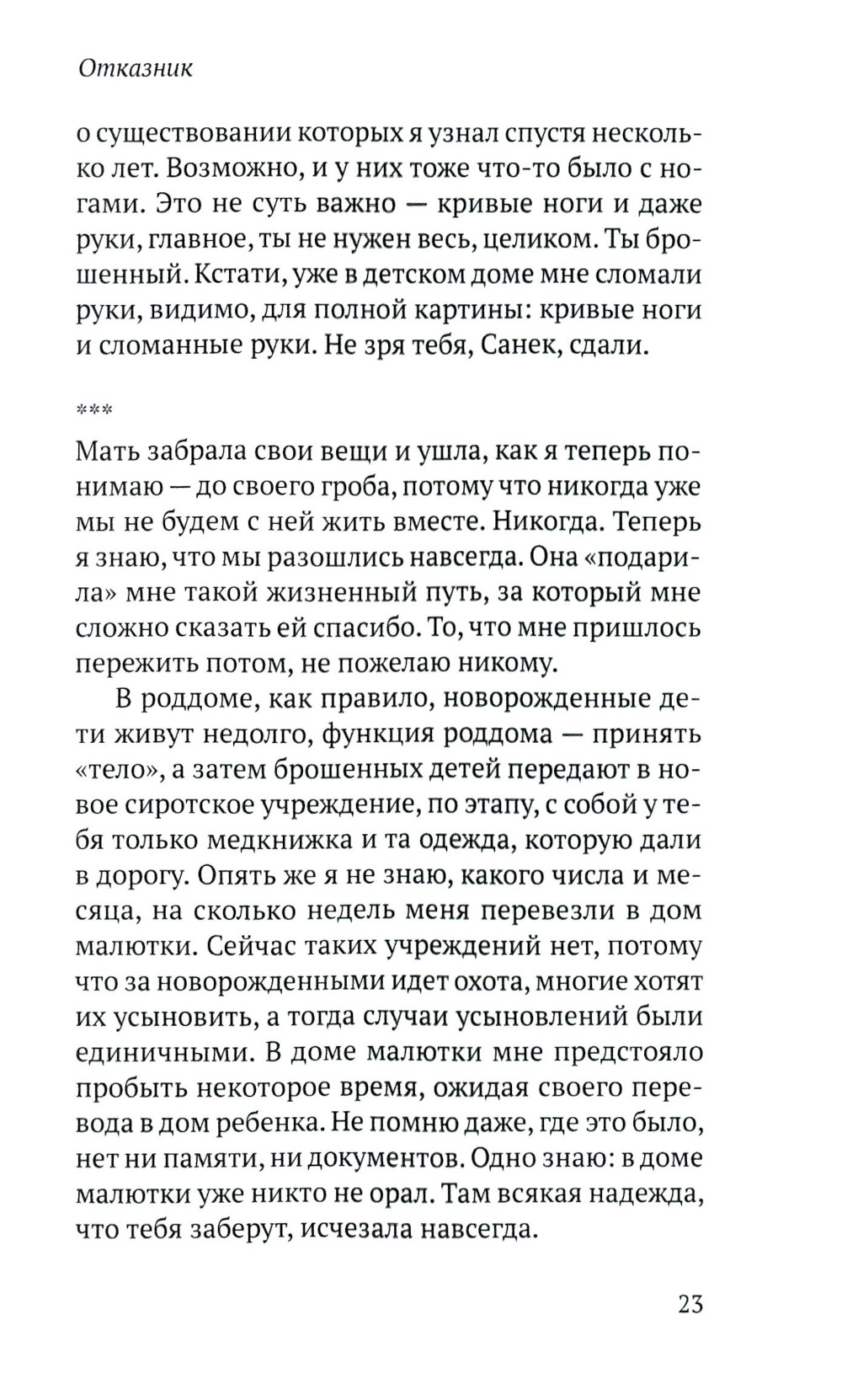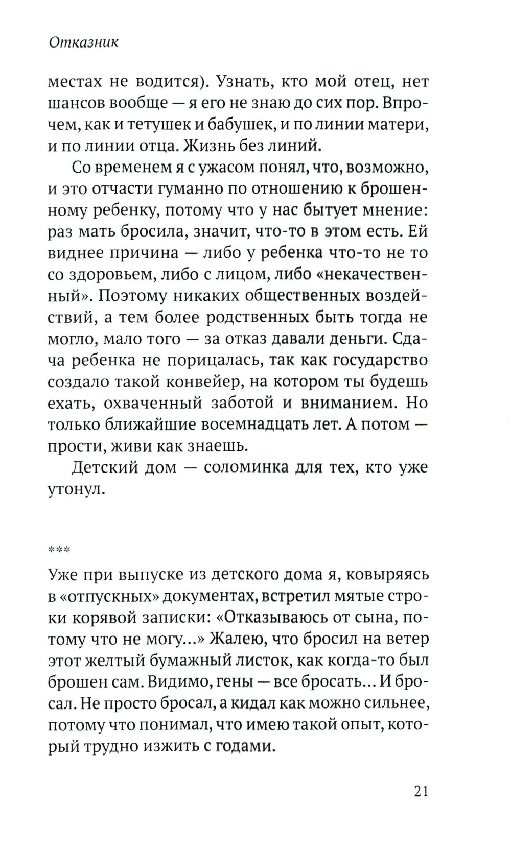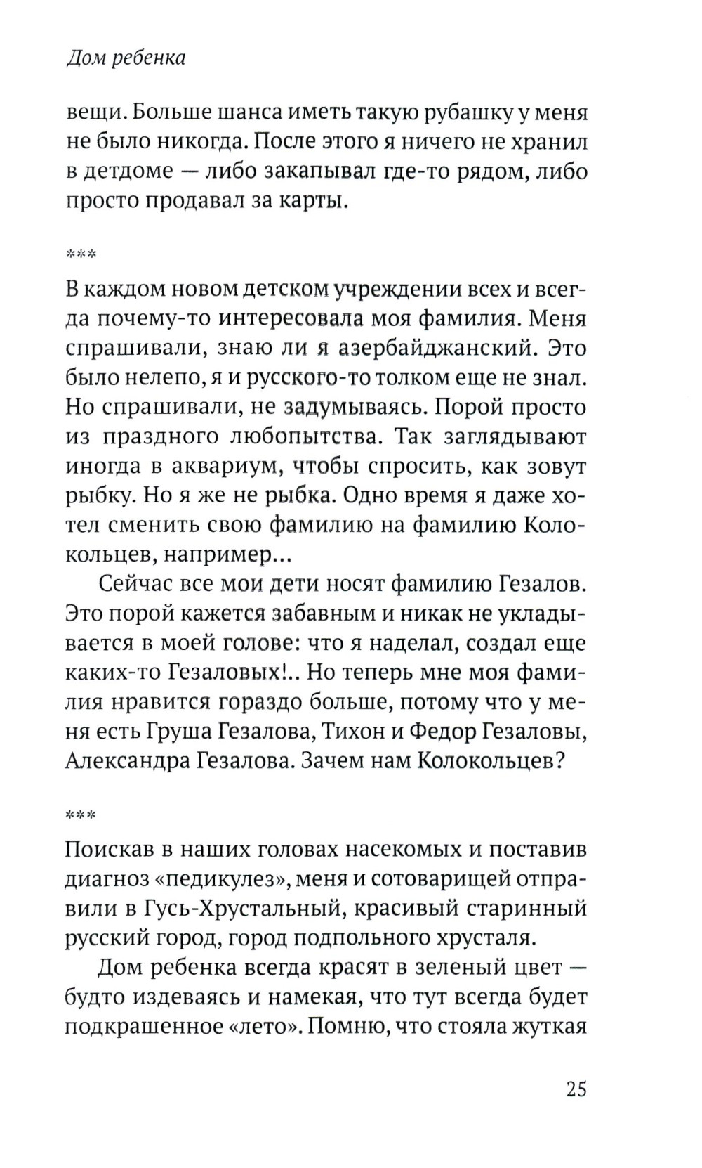 Книга «Соленое детство» написана детдомовцем Александром Гезаловым, человеком, как он сам о себе говорит, «с ампутированным детством». Он смог преодолеть невероятные трудности, не попал в тюрьму и не спился, причем не только сумел уйти из «подвалов общества», но и создал организацию, которая активно помогает детям-сиротам, осужденным, лицам без определенного места жительства. Спустя годы после выхода из детского дома автор возвращается в сиротское детство, чтобы помочь другим. В книге от первого лица рассказывается о любви и ненависти, добре и зле, о боли и пути человека, который смог выбраться из колеи и стать собой.| Издательство | Изд. НИКЕЯ |