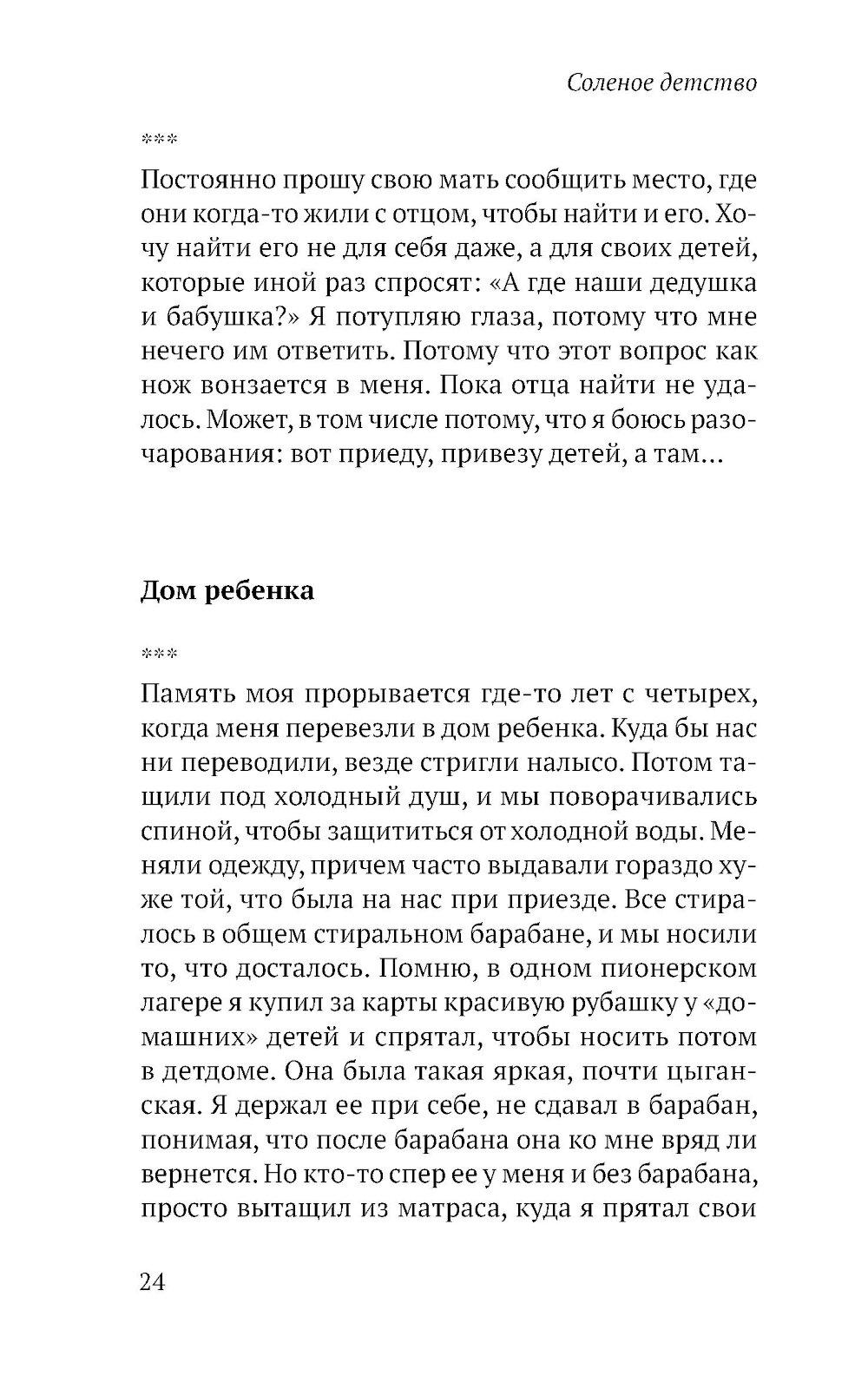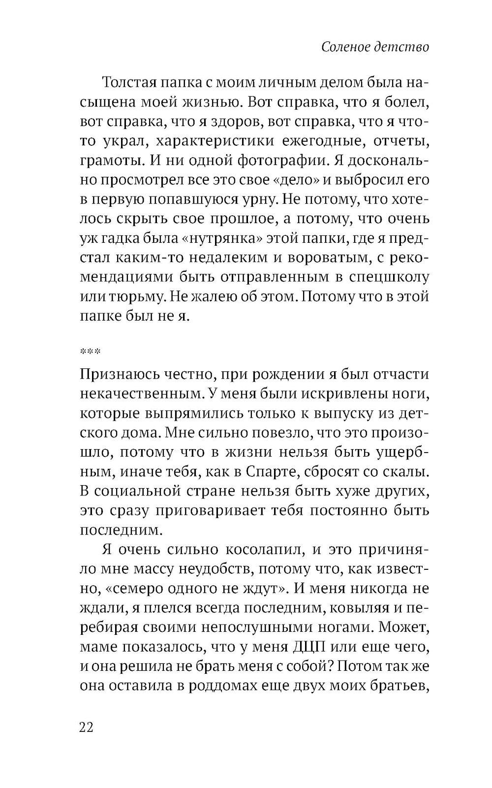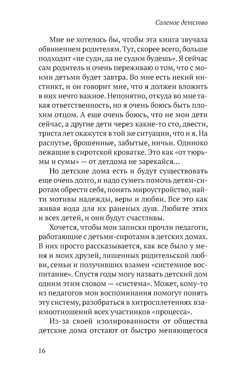 Книга «Соленое детство» - это исповедь бывшего детдомовца о своем «ампутированном» детстве, это история «мальчика, который выжил», это книга о силе человеческой личности.| Издательство | Изд. НИКЕЯ |