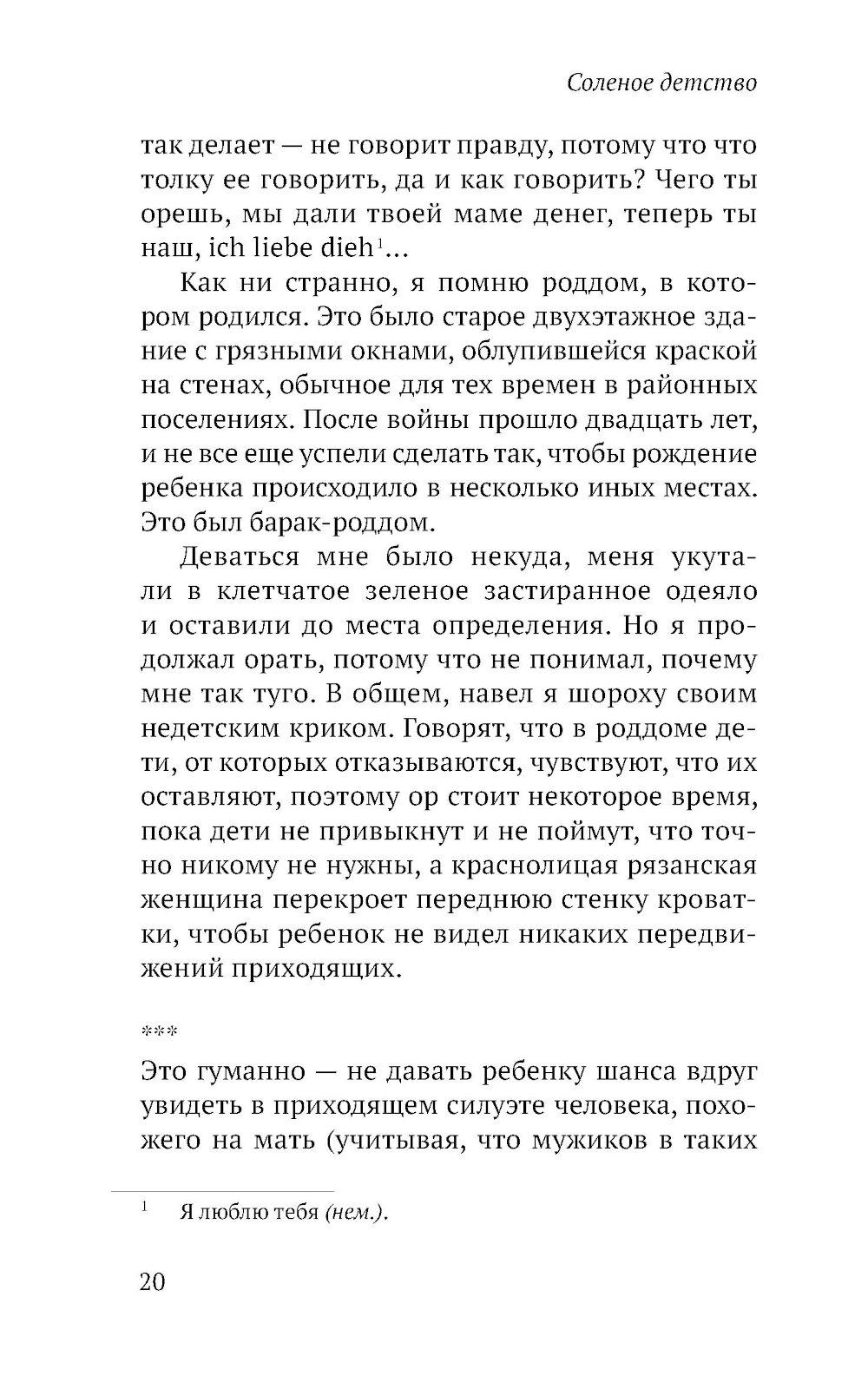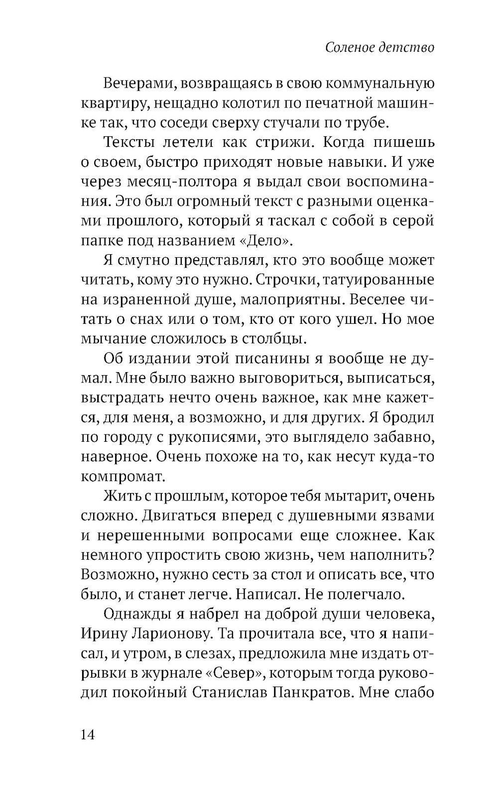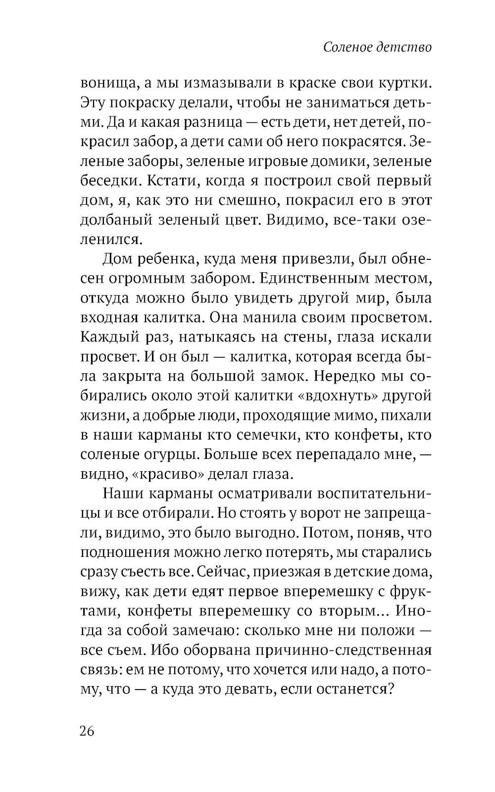 Книга «Соленое детство» - это исповедь бывшего детдомовца о своем «ампутированном» детстве, это история «мальчика, который выжил», это книга о силе человеческой личности.| Издательство | Изд. НИКЕЯ |