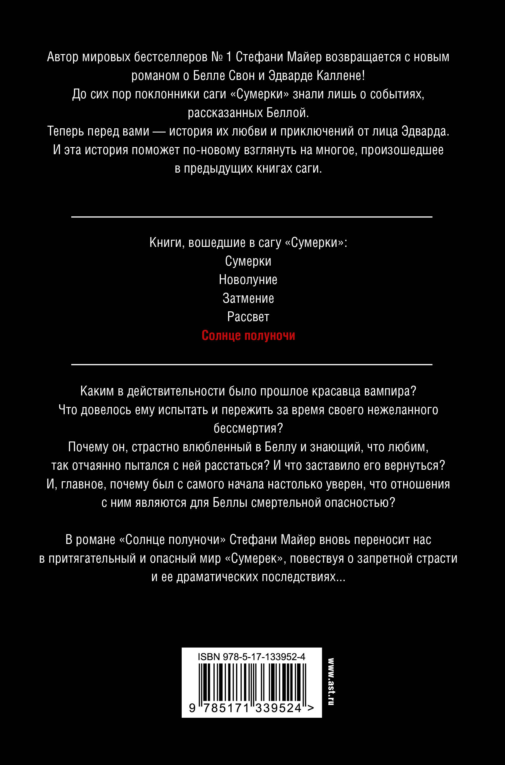 Впервые на русском языке выходит «Солнце полуночи» - новая глава «Сумеречной саги» от автора культовых романов «Сумерки», «Новолуние», «Затмение» и «Рассвет» Стефани Майер. Писательница поставила точку в истории любви Эдварда Каллена и Беллы Свон ещё в 2008 году, но новая книга переносит нас в самое начало истории и позволяет взглянуть на казавшиеся знакомыми события другими глазами… глазами вампира. Вся «Сумеречная cага» показана от лица Беллы Свон. Однако Белла не могла поведать о том, чему не была свидетельницей или чего просто не знала. В «Солнце полуночи» Эдвард впервые берёт слово и рассказывает свою историю. Каким в действительности было прошлое красавца вампира? Что он испытал за время своего нежеланного бессмертия? Почему с самого начала подозревал, что его отношения с Беллой подвергнут её жизнь смертельной опасности? Почему он пребывал в жуткой депрессии, считал себя не заслуживающим счастливого конца злодеем и был готов перебить всех одноклассников? И, наконец, почему парень, ставший свидетелем двух мировых войн, Великой депрессии, Холодной войны, Вьетнама, Уотергейта, Афганистана и краха социалистического блока самым волнующим событием своей жизни счёл встречу с семнадцатилетней школьницей? В романе «Солнце полуночи» Стефани Майер вновь переносит нас в притягательный и опасный мир «Сумеречной саги» и повествует о запретной страсти и её драматических последствиях. Идеально для поклонников «Сумерек», а также поклонников циклов «Голодные игры», «Бегущий в лабиринте» и «Дивергент».| Издательство | ИЗДАТЕЛЬСТВО "АСТ" |