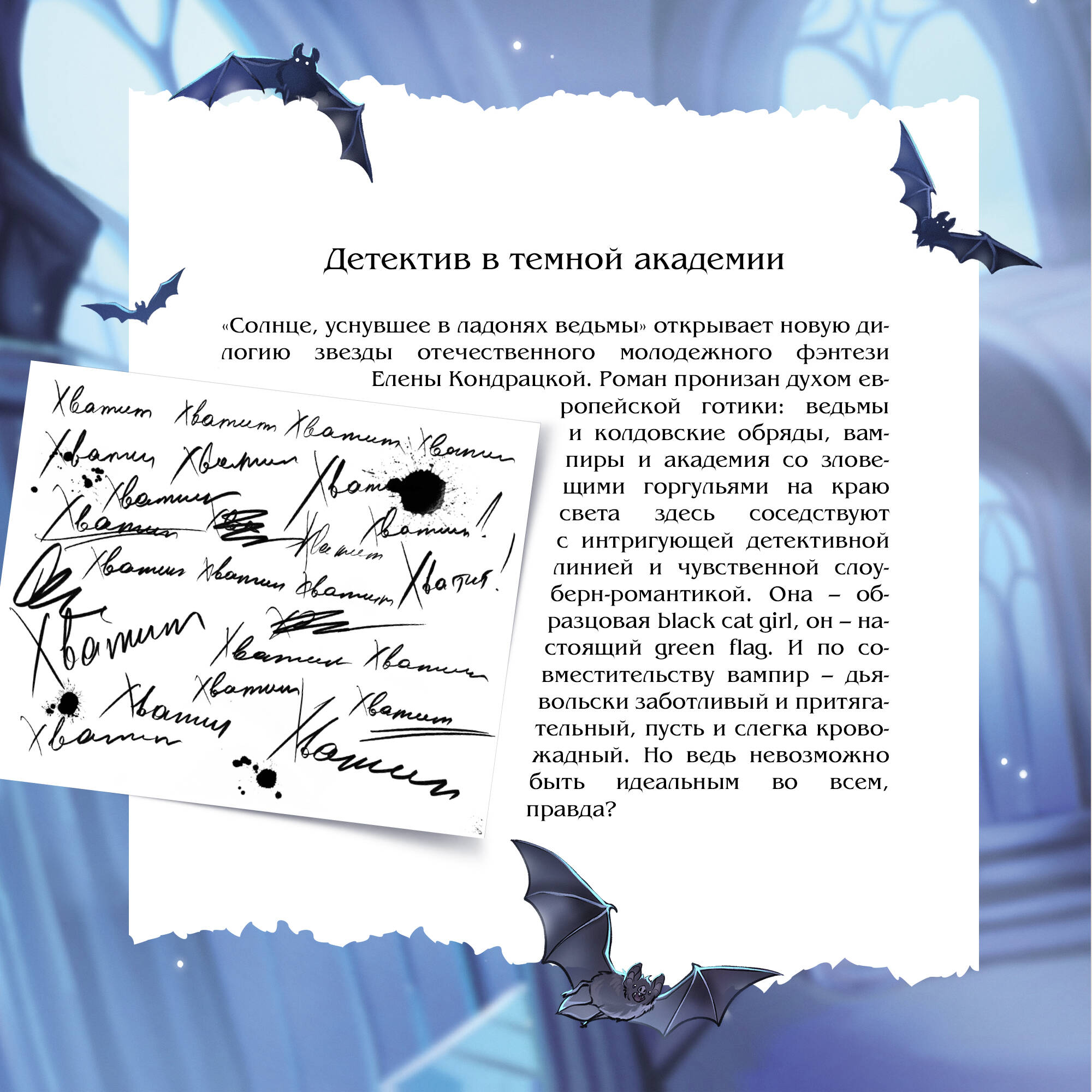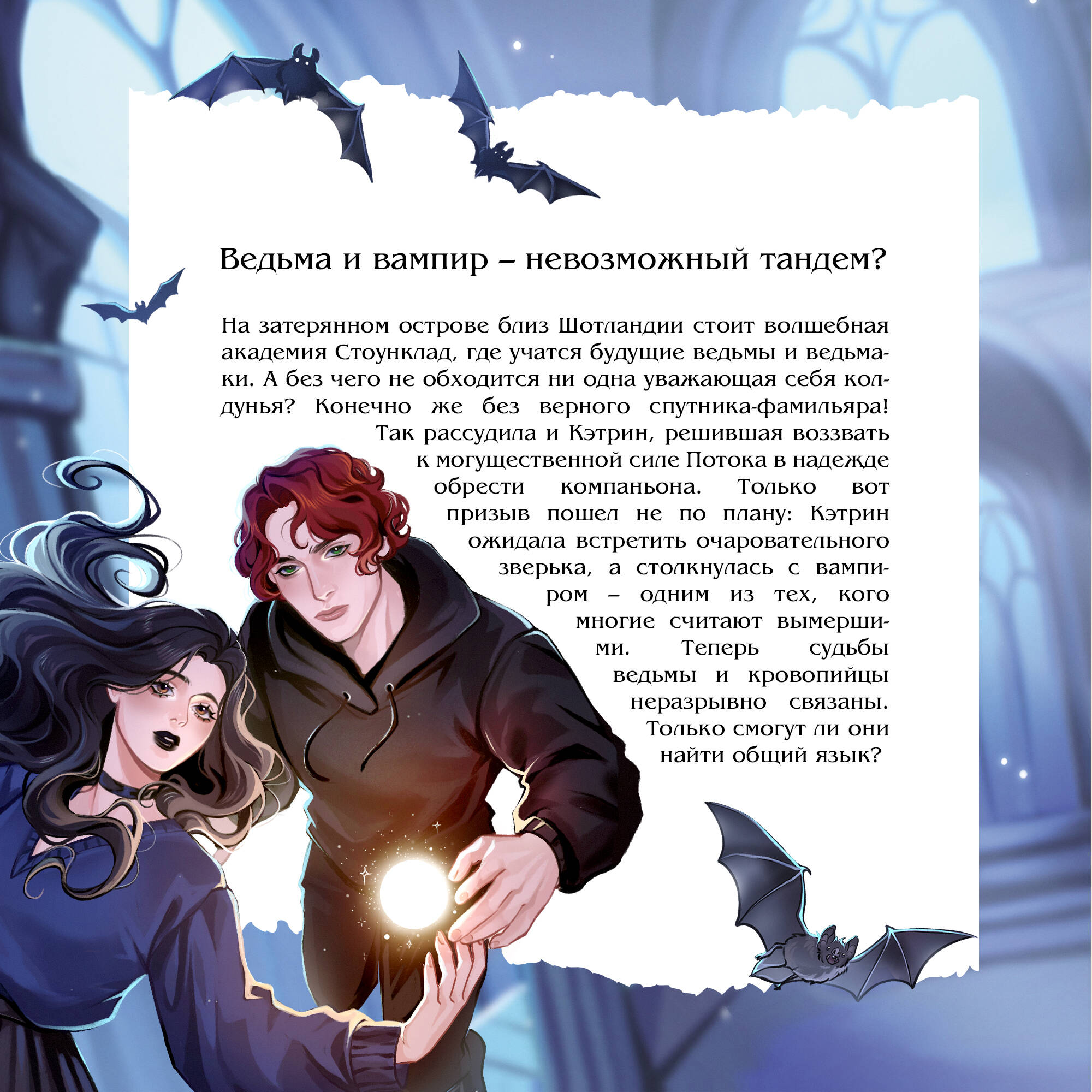 Кэтрин - студентка академии ведьм и ведьмаков, спрятанной на острове у берегов Шотландии. Но какая же ведьма обходится без фамильяра? Поиски волшебного помощника заводят Кэтрин в темный лес, но вместо милого зверька она находит свою перепуганную однокурсницу и... настоящего вампира. Но как такое возможно? Надзор истребил этих опасных существ больше ста лет назад. Откуда он взялся и какую опасность для обитателей академии несет его загадочное расследование? Новинка! Первая часть новой дилогии Елены Кондрацкой. Ведьмы, вампиры, кровавые ритуалы и мрачная атмосфера закрытой академии. А еще - живые горгульи. Напряженный slow burn, запретные и опасные отношения. Смертельно опасные. Главный герой - green flag. И кровожадный вампир. Да, так бывает. Наверное… Главная героиня - black cat girl. Любит чокеры, черную помаду и свой синий свитер. Людей она не любит. И вампиров тоже. Особенно рыжих. Эта книга, как американские горки: вот вы вместе с героями на студенческой вечеринке весело рассуждаете о Шопенгауэре, а уже на следующей странице обнаруживаете таинственное убийство. И нетопыря. Милого рыжего нетопыря. Иллюстрация на обложке Valentaine. Макет подготовила Eumiltn (Евгения Морозова), а Елена Кондрацкая отрисовала для издания удивительные черно-белые иллюстрации.| Издательство | ООО "Издательство "Эксмо" |