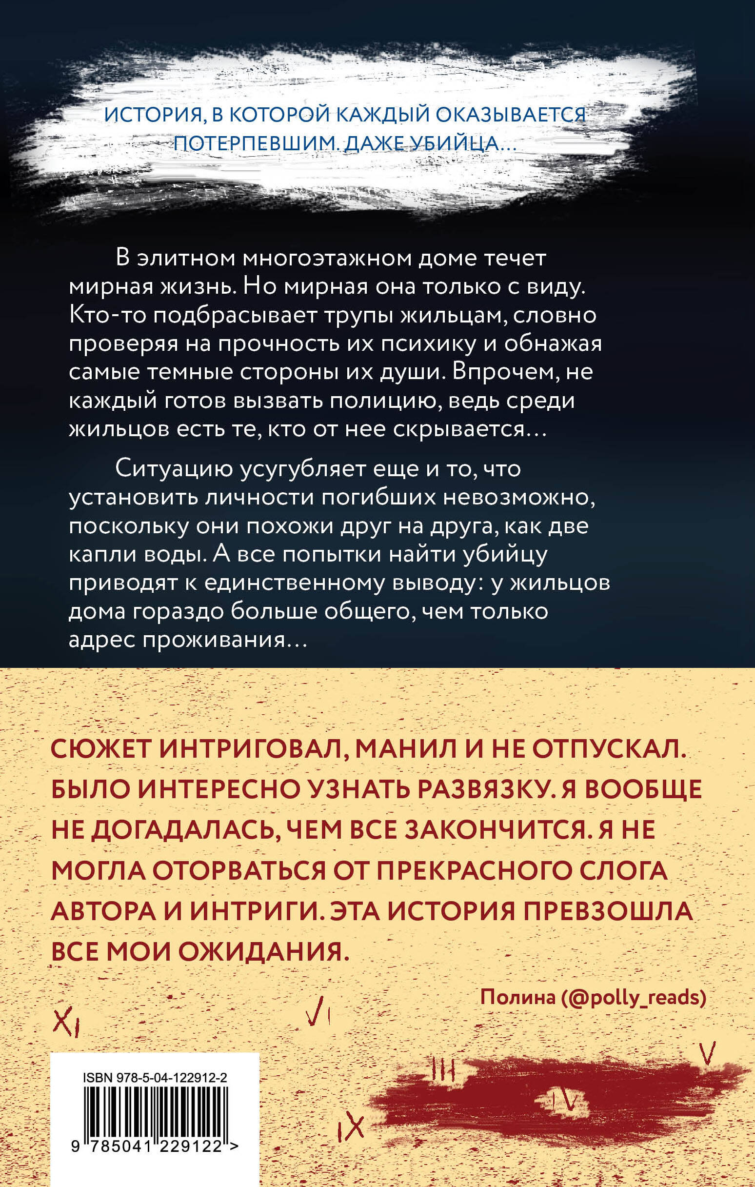 История, в которой каждый оказывается потерпевшим. Даже убийца… В элитном многоэтажном доме течет мирная жизнь. Но мирная она только с виду. Кто-то подбрасывает трупы жильцам, словно проверяя на прочность их психику и обнажая самые темные стороны их души. Впрочем, не каждый готов вызвать полицию, ведь среди жильцов есть те, кто от нее скрывается… Ситуацию усугубляет еще и то, что установить личности погибших невозможно, поскольку они похожи друг на друга, как две капли воды. А все попытки найти убийцу приводят к единственному выводу: у жильцов дома гораздо больше общего, чем только адрес проживания… Отзыв: «Сюжет интриговал, манил и не отпускал. Было интересно узнать развязку. Я вообще не догадалась, чем все закончится. Я не могла оторваться от прекрасного слога автора и интриги. Эта история превзошла все мои ожидания». - Полина (@polly.reads)| Издательство | Эксмо |