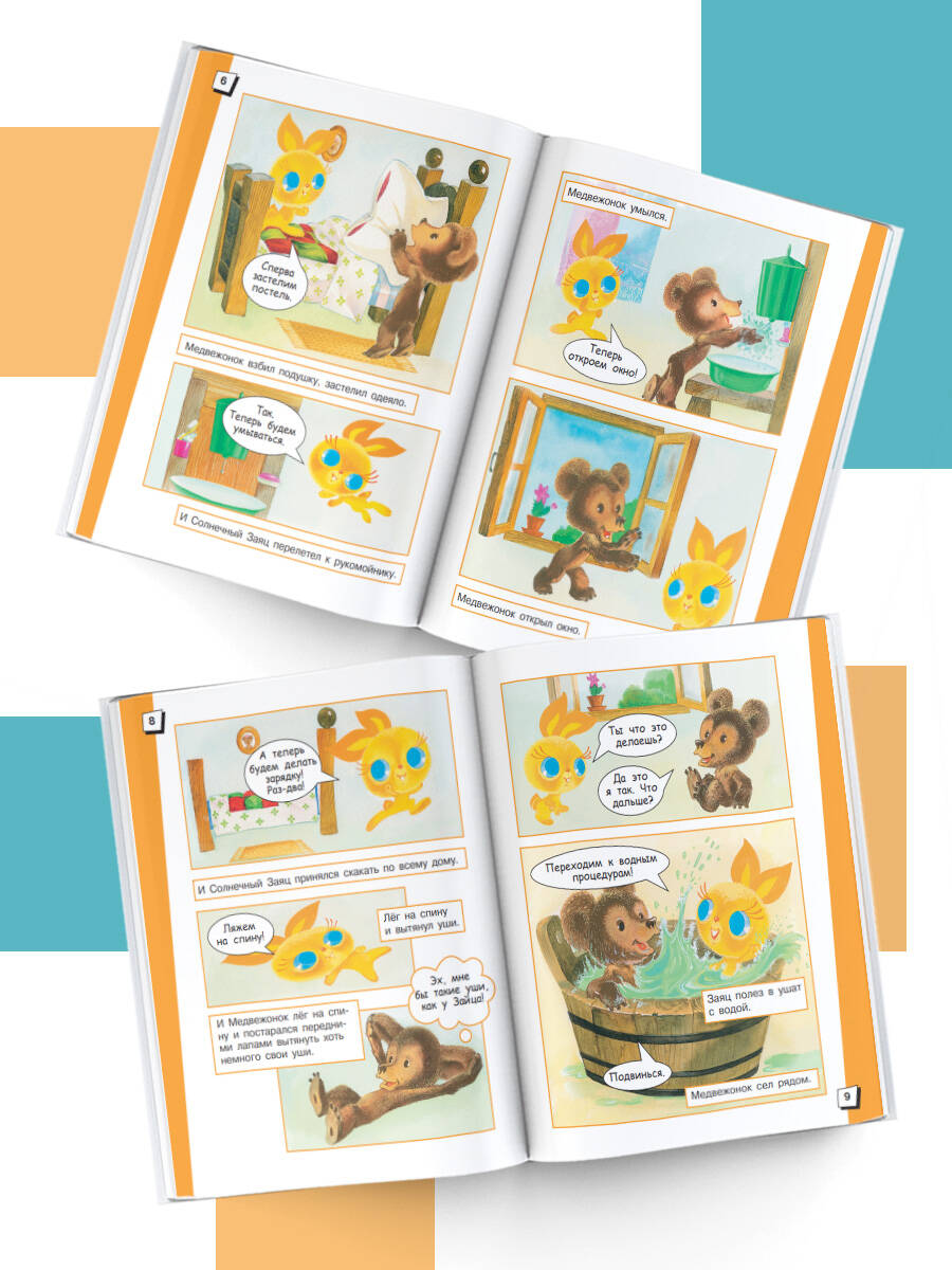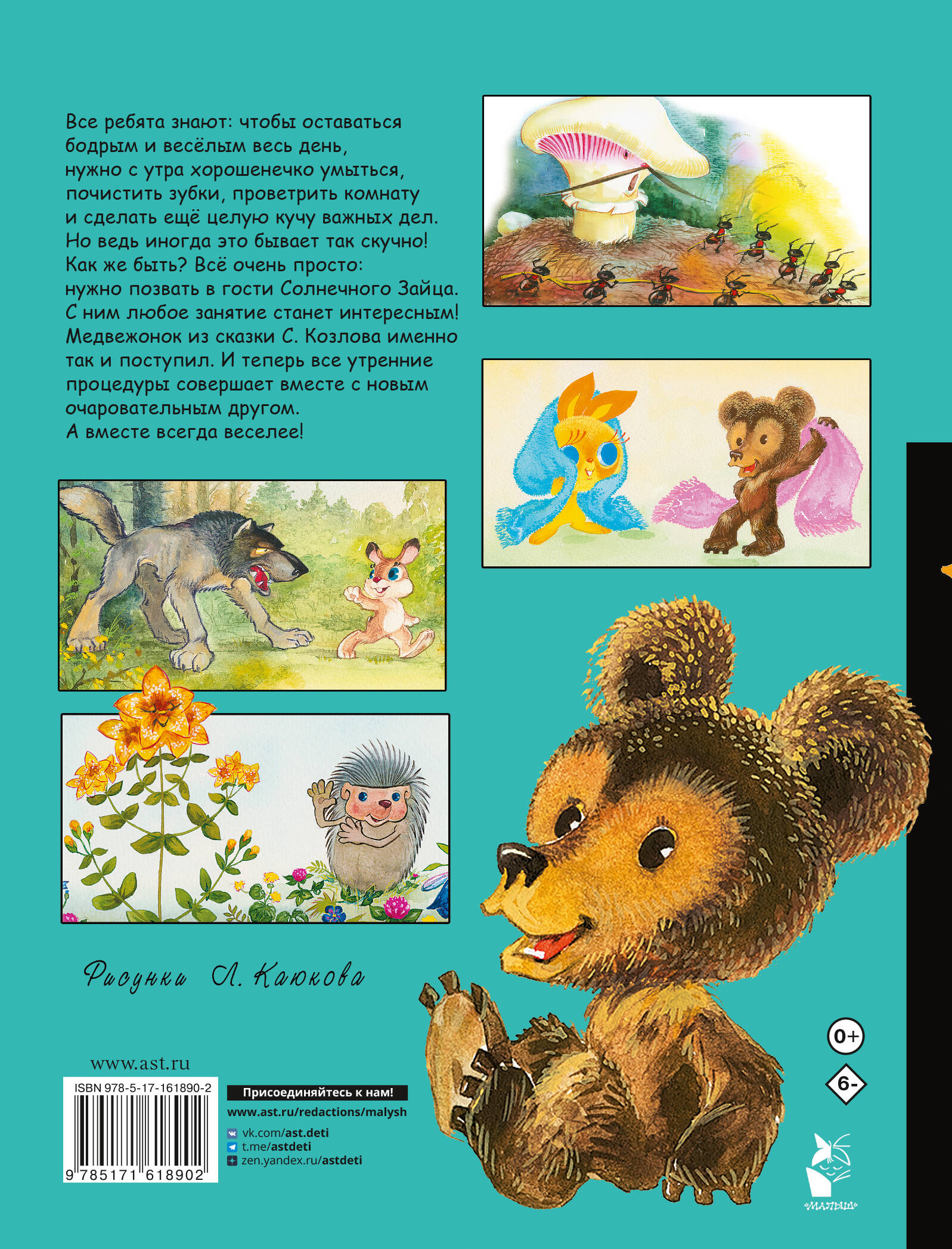 Все ребята знают: чтобы оставаться бодрым и весёлым весь день, нужно с утра хорошенечко умыться, почистить зубки, проветрить комнату и сделать ещё целую кучу важных дел. Но ведь иногда это бывает так скучно! Как же быть? Всё очень просто: нужно позвать в гости Солнечного Зайца. С ним любое занятие станет интересным! Медвежонок из сказки Сергея Козлова именно так и поступил. И теперь все утренние процедуры совершает вместе с новым очаровательным другом. А вместе всегда веселее!| Издательство | Издательство "АСТ" |