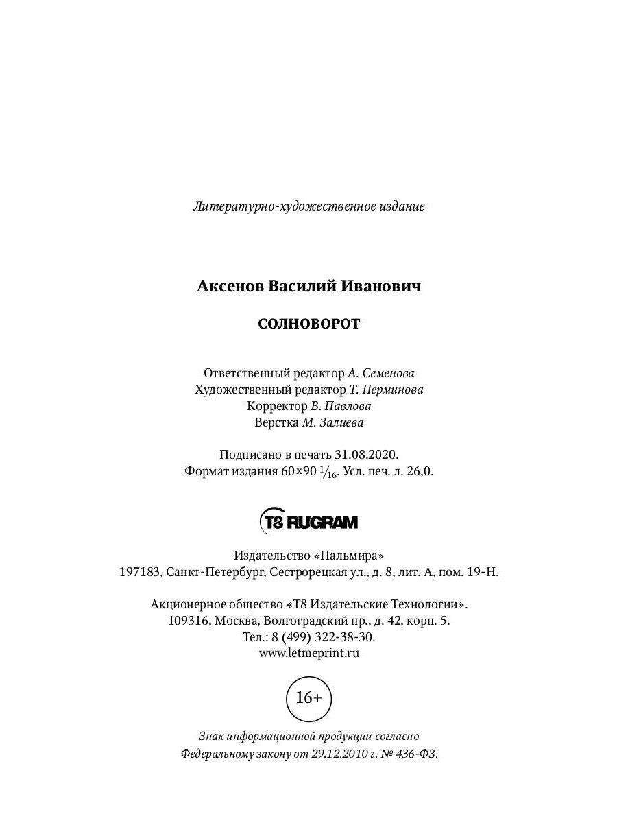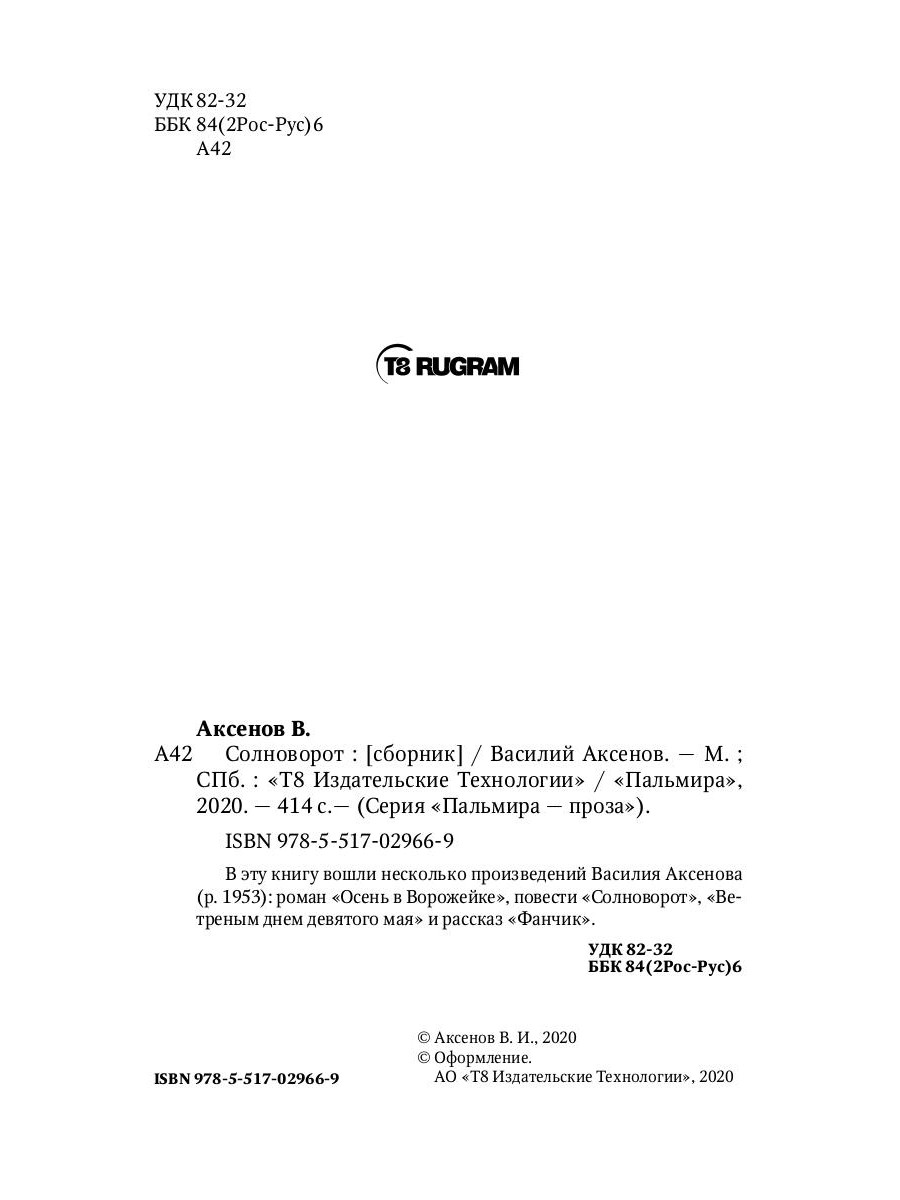 В эту книгу вошли несколько произведений Василия Аксенова (р. 1953): роман «Осень в Ворожейке», повести «Солноворот», «Ветреным днем девятого мая» и рассказ «Фанчик».| Издательство | Т8 RUGRAM |