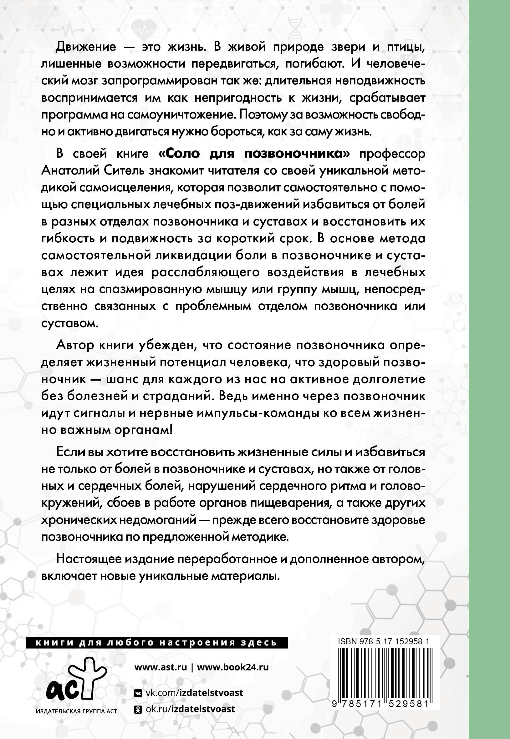 Ситель Анатолий Болеславович - главный врач Федерального центра мануальной терапии, профессор, доктор медицинских наук, заслуженный врач Российской Федерации. Движение - это жизнь. В живой природе звери и птицы, лишенные возможности передвигаться, погибают. И человеческий мозг запрограммирован так же: длительная неподвижность воспринимается им как непригодность к жизни, срабатывает программа на самоуничтожение. Поэтому за возможность свободно и активно двигаться нужно бороться, как за саму жизнь. В книге "Соло для позвоночника - в упражнениях!" профессор Анатолий Ситель знакомит читателя со своей уникальной методикой самоисцеления, которая позволит самостоятельно с помощью специальных лечебных поз-движений избавиться от болей в разных отделах позвоночника и суставах и восстановить их гибкость и подвижность за короткий срок. В основе метода самостоятельной ликвидации боли в позвоночнике и суставах лежит идея расслабляющего воздействия в лечебных целях на спазмированную мышцу или группу мышц, непосредственно связанных с проблемным отделом позвоночника или суставом. Несколько недель жизни по рекомендациям, данным в этой книге, избавят вас от боли и сделают ваш позвоночник гибким и подвижным! Идеальная возможность избавиться от боли самостоятельно! Лечебные позы-движения проиллюстрированы фотографиями, снабжены понятными, доступными и простыми комментариями. Автор книги убежден, что состояние позвоночника определяет жизненный потенциал человека, что здоровый позвоночник - шанс для каждого из нас на активное долголетие без болезней и страданий. Ведь именно через позвоночник идут сигналы и нервные импульсы-команды ко всем жизненно важным органам! Если вы хотите восстановить жизненные силы и избавиться не только от болей в позвоночнике и суставах, но также от головных и сердечных болей, нарушений сердечного ритма и головокружений, сбоев в работе органов пищеварения, а также других хронических недомоганий - прежде всего восстановите здоровье позвоночника по предложенной методике. Данная книга не является учебником по медицине, все рекомендации, приведенные в ней, использовать только после согласования с лечащим врачом.| Издательство | ИЗДАТЕЛЬСТВО "АСТ" |