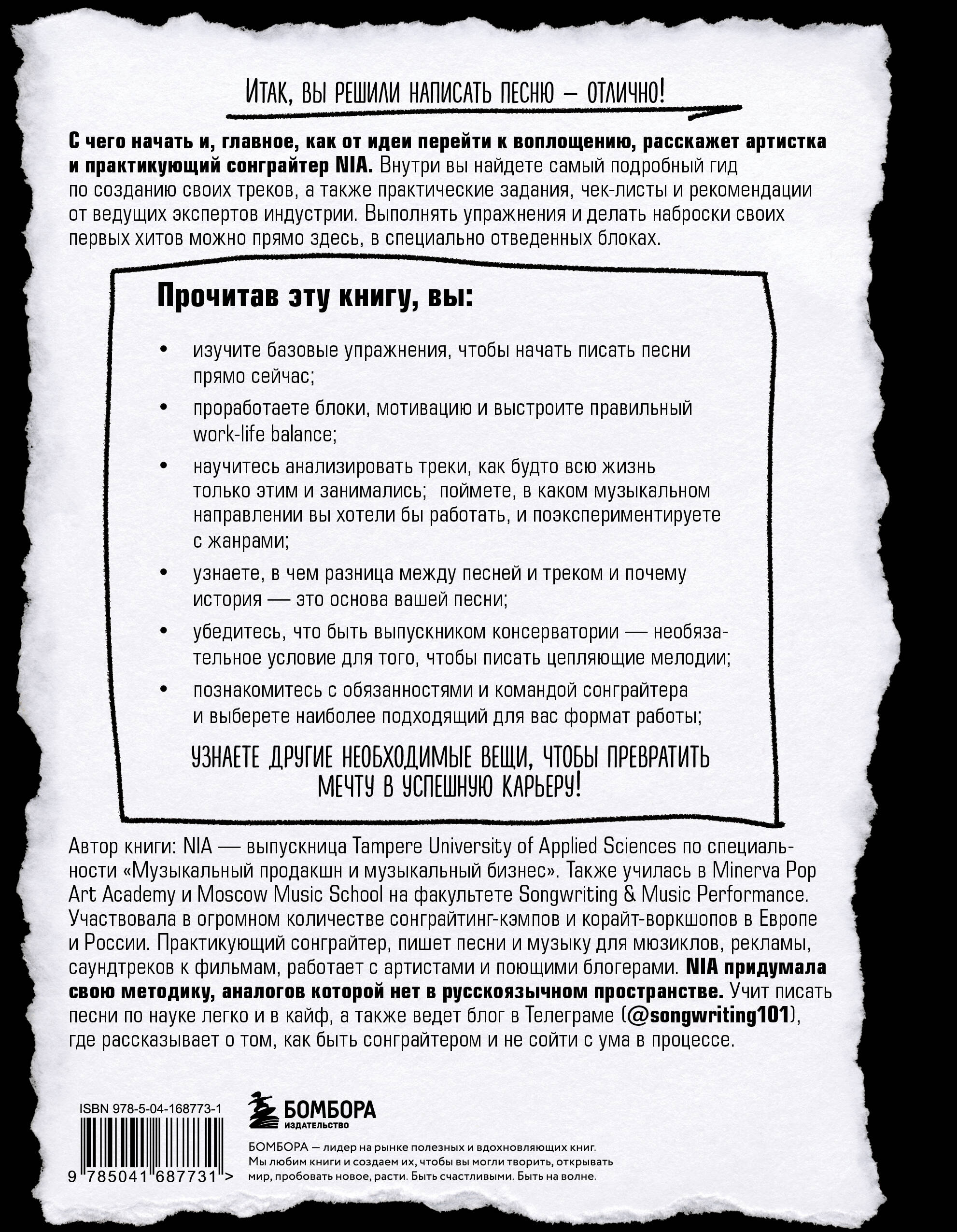 Самое подробное и пошаговое руководство для тех, кто хочет перейти от мечты о собственных песнях к карьере сонграйтера. Автор книги «Сонграйтинг - практическое руководство для тех, кто хочет писать хиты» NIA придумала свою методику, аналогов которой нет в русскоязычном пространстве. Она научит вас писать песни по науке легко и в кайф, не потерять мотивацию, найти свой стиль и превратить хобби в прибыльную карьеру. Из этой книги вы: - узнаете о способах создания песни и выберете наиболее комфортный для вас; - обретете базовые навыки в теории музыки; - научитесь анализировать треки, как будто всю жизнь только этим и занимались; - поймете, в каком музыкальном направлении вы хотели бы работать и поэкспериментируете с жанрами; - сможете отличить плохой фидбек от хорошего и разберетесь, почему не нужно бояться критики; - узнаете, какой должна быть мелодия, чтобы ваши слушатели запустили ее к себе в сознание на ПМЖ; - и почему формула хита не работает (но не нужно отчаиваться!). А чтобы процесс изучения был понятнее и проще, автор книги подготовила и практические задания, и чек-листы, и даже собрала советы от опытных игроков индустрии. Выполнять упражнения и делать наброски своих первых хитов можно прямо в книге, в специально отведенных блоках. NIA - артистка и сонграйтер. Выпускница Tampere University of Applied Sciences по специальности «Музыкальный продакшен и музыкальный бизнес». Также училась в Minerva Pop Art Academy и Moscow Music School на факультете Songwriting & Music Performance. Участвовала в огромном количестве сонграйтинг-кэмпов и корайт-воркшопов в Европе и России (от питчинга треков для музыкального лейбла «Sony Music» на шоукейс-фестивале Eurosonic до работы с топовыми европейскими и московскими музыкальными продюсерами). Практикующий сонграйтер, пишет песни и музыку для мюзиклов, рекламы, саундтреков к фильмам, работает с артистами и поющими блогерами. В качестве эксперта по сонграйтингу выступала на TAMK International Week, сотрудничала со Skillbox, Artist Pro, Moscow Music School, приложением «СТУДИО» от HiFi-стриминга «Звук», конкурсами «ПРО ПЕСНИ» и «Академия звука». NIA также ведет блог в Телеграме (@songwriting101), где рассказывает о том, как быть сонграйтером и не сойти с ума в процессе. 6 июля 2023 года у NIA вышел дебютный альбом «Такие дела», который попал в Топ-чарт ВК и набрал 666 тысяч прослушиваний за три дня. Послушать его, как и все остальные релизы исполнительницы, можно на всех стриминговых платформах.| Издательство | ООО "Издательство "Эксмо" |